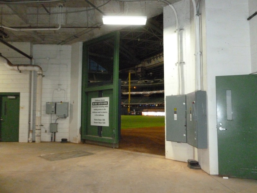 I got to park in the VIP lot, thanks Tyler (Barnes, the VP of Communications), and entered Miller Park through the south dock, where media members and the players enter. Upon entering I ran into the guy who was handing out credentials. I told him my name and of course there wasn’t anything for me. I wound up just pulling up an email I had received from Tyler a few days earlier detailing where I should go, showed it to him, and was on my way. 50 yards away was my first glimpse of the field on the day that I think should be a state holiday.