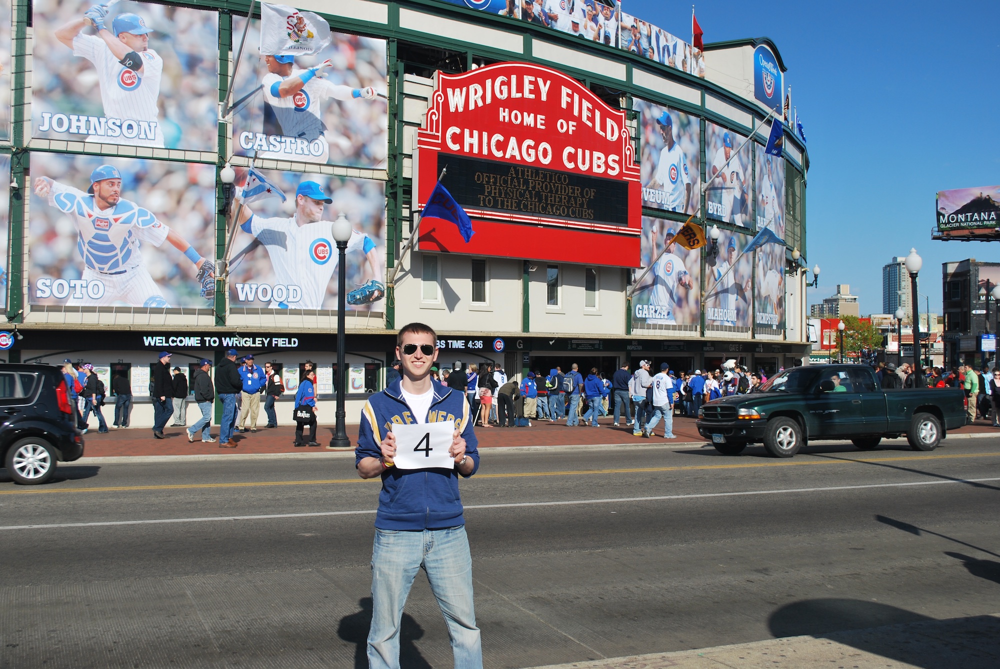We jumped on the Red Line on State Street, and headed up towards Wrigley. Shortly after arriving we spent some time trying to get a good game number 4 picture. With all the traffic, it makes it a little tricky. We tried a few different spots, and thought we had a good one, but there’s a taxi van right below the Wrigley Field sign, so we settled with this: