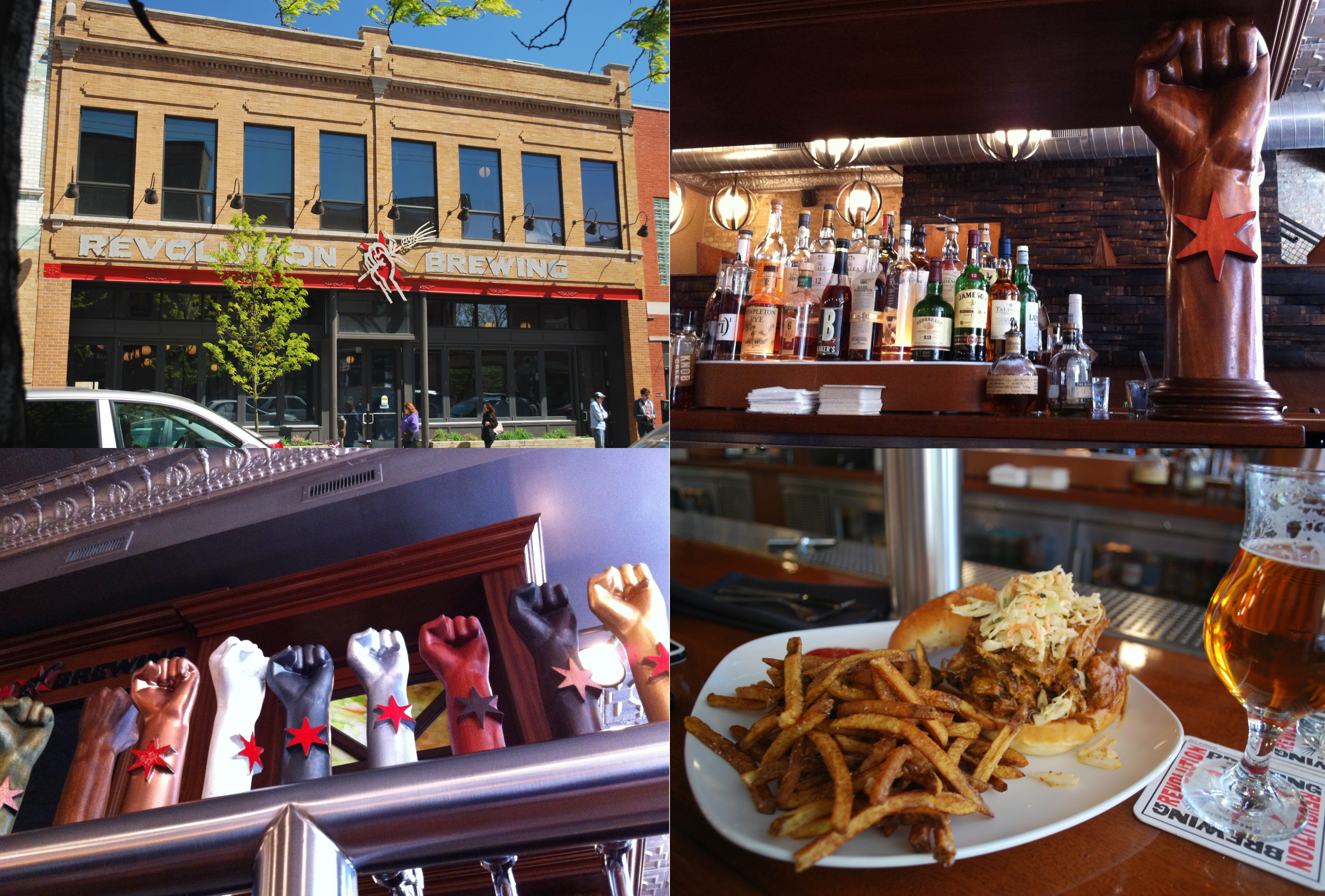 I ate lunch at Revolution Brewing on Milwaukee Avenue, and was not disappointed. As you can see from the pictures below, they use a closed fist as their calling card. Going clockwise from top left you have; the exterior of the building, the bar (with wooden fists supporting the structure above the bar), my lunch, and the tap handles.