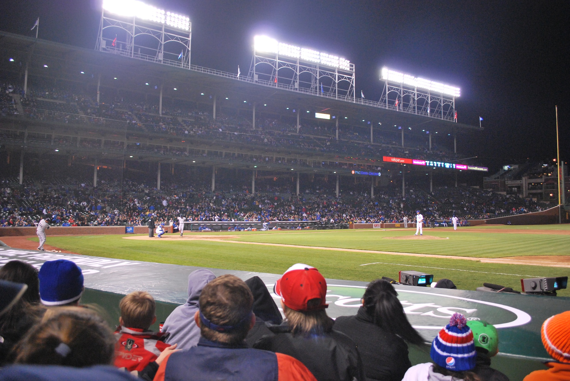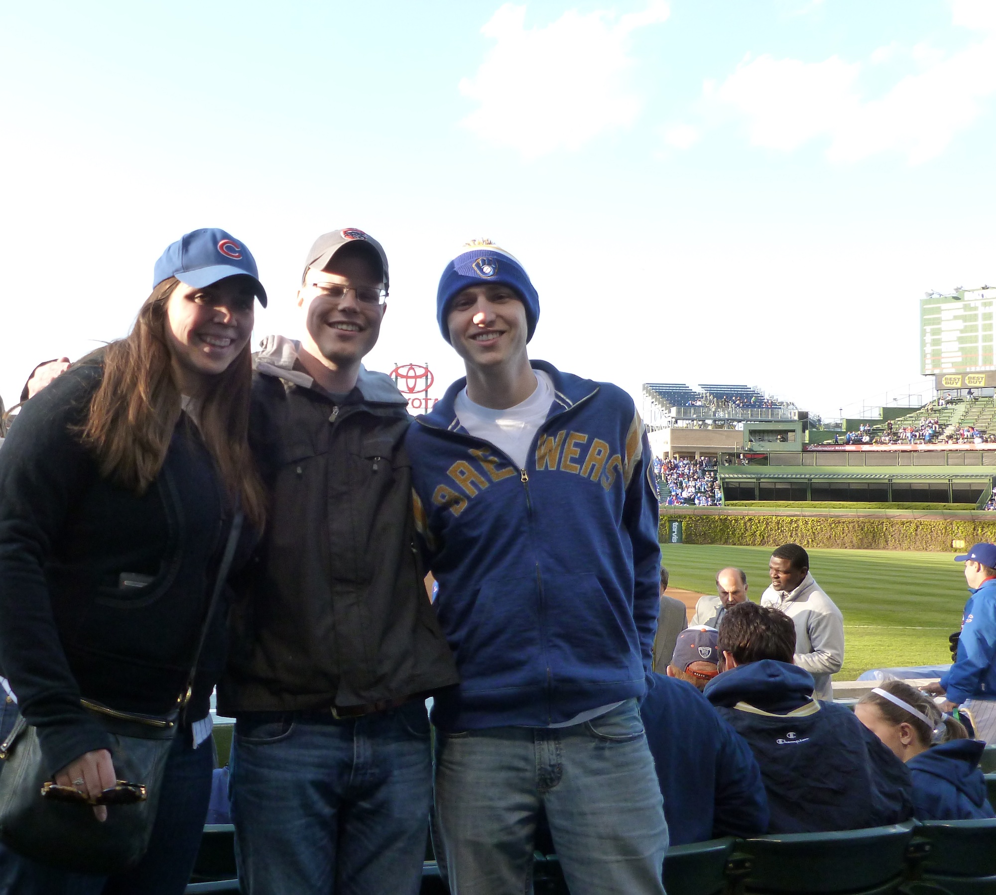 At 5:30 Alex I headed back to Wrigley, got a hot dog, and found our seats. I think it’s crazy that I was able to get the seats I did, seeing that I bought them just 10 days ago. We met up with Katie, a friend from UW-Madison. Alex, Katie, and I all lived in the same dorm freshman year. Katie lives in Wrigleyville and can probably smell the ballpark food from her apartment that is just a half block away. Before the game we got our picture taken, we were standing but the guy taking the picture was sitting, so you can’t really tell where we are. Telly Hughes, who I’ll be speaking with on Brewers Live later today, is (unintentionally) photo bombing the picture.