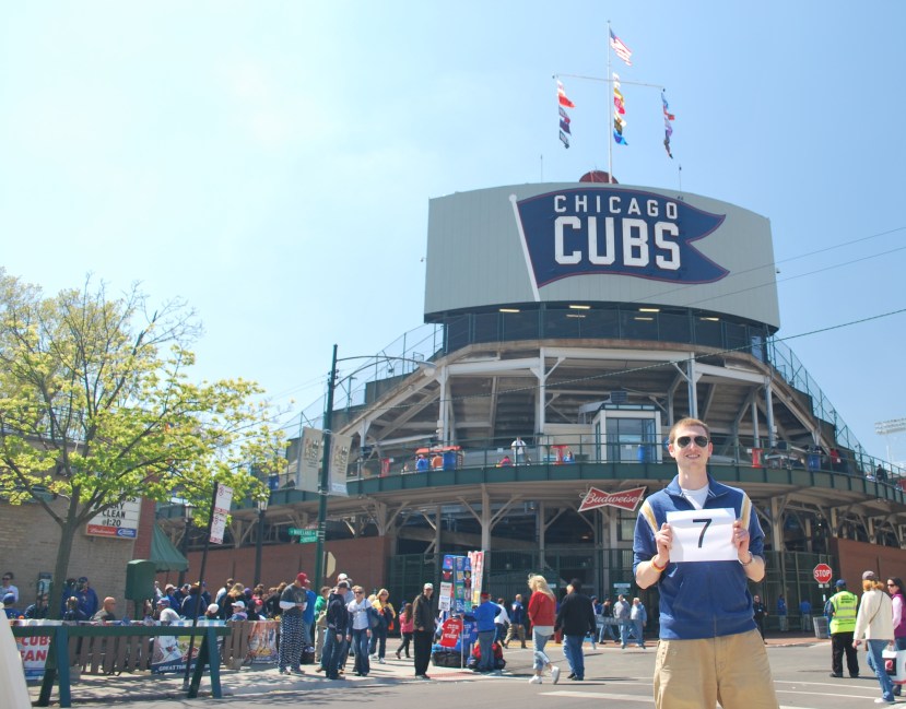 I walked up California to Addison and jumped on the 152 bus, which took me right to Wrigley Field. I arrived with about an hour to spare, which worked out well. I wanted to get a good shot for game number seven, and have plenty of time to find my seat. I headed up Sheffield and worked my way around Wrigley, so I could get my picture taken with the back of the scoreboard behind me. There was a family who was doing the same thing and I asked the husband (Dave), if he’d help me out. He asked about the sign and I told him what I was trying to do, and he thought it was awesome. I mentioned my name and he said he knew a Ben *Rous*, but I told him mine had an e at the end. He gave me his business card and said if I ever needed anything when I was in Chicago to contact him. The result of his picture:
