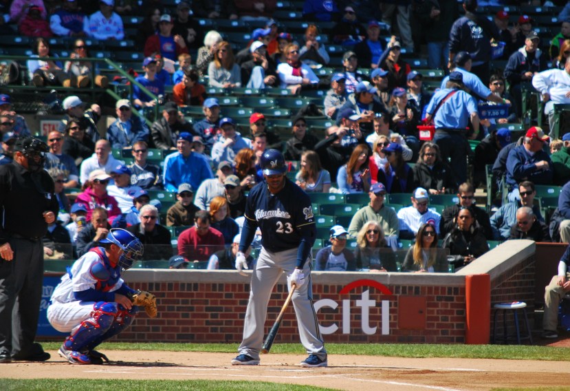 My seat was in the sun today, and I was grateful after the two previous games where I froze. Luckily I remembered sun screen, otherwise my face would’ve gotten lobsteriffic. I took a few pictures early in the game. This first one is of Rickie Weeks getting set in the box in the first inning.