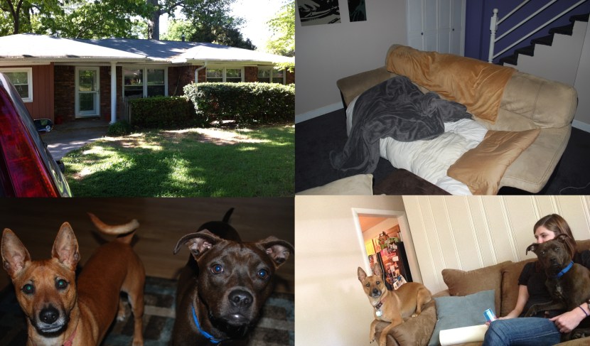 The Atlanta airport is south of the city, and Annette and Dave, her boyfriend, live northeast of downtown. It’s about a 23 mile drive but with Atlanta traffic, you never know how long it’s going to take. 10:00 am traffic was good though, and it took about 25 minutes. Annette lives with Dave and a roommate, Amanda. Below you have their house, the couch I’ll be sleeping on, their two dogs acting like cats, and the dogs intrigued by my camera. Boscoe, the light brown one, is part Basenji part chihuahua, and likely something else. Jozy is a pit bull lab mix, or so they think.