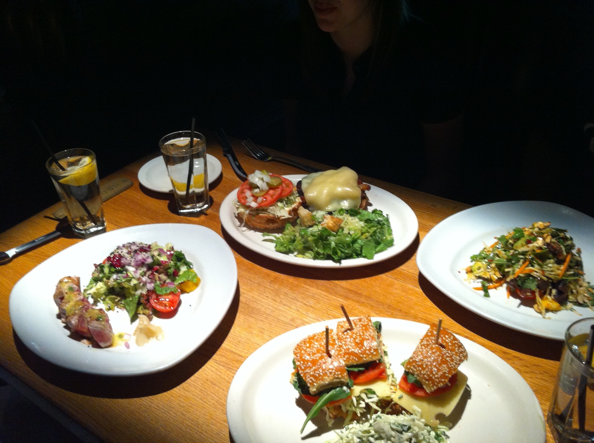 Annette and Dave are both in Pharmacy school at Mercer, Dave is in his third year, Annette in her second. The undergraduate campus is in Macon, Georgia, but the graduate and professional campus is in Atlanta. Annette had some things to get done at school, so I tagged along. We came back to the house, picked up Dave and Kate, another pharmacy student, and went to lunch at Houston’s. Annette and Dave’s roommate, Amanda, is a general manager at the Houston’s we went to in Buckhead, a neighborhood in Atlanta. The food was delicious, and is pictured below. On the lower left is Kate’s meal, which was an Ahi Tuna Salad. On the upper left is Annette’s lunch, which was a veggie burger with… drumroll…… BACON. She’s not a vegetarian and she said she just really likes the veggie burger, and bacon. Dave’s lunch is the Thai Steak Salad, pictured in the top right. I had an amazing Chicken sandwich with arugula, tomato, onion, and slaw. I like coleslaw so much that I also got it as my side instead of fries.