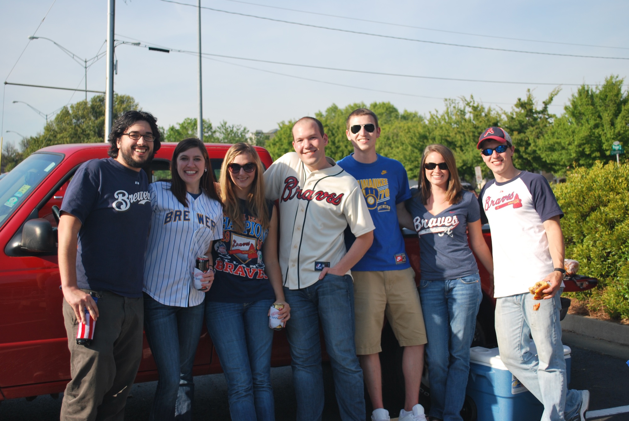 I don’t know if the best place for a grill is on very dry grass, and next to flammable pine needles. I don’t know why they wouldn’t have told us to put it on the blacktop. Any thoughts? We drank some beers, ate some food, and played some washers. I feel like there is a lot more luck involved in washers than there is with corn hole (bags for you non-traditionalists). There were seven of us and a good time was had by all. I asked a Braves fan if she would kindly take a picture for us and she obliged.