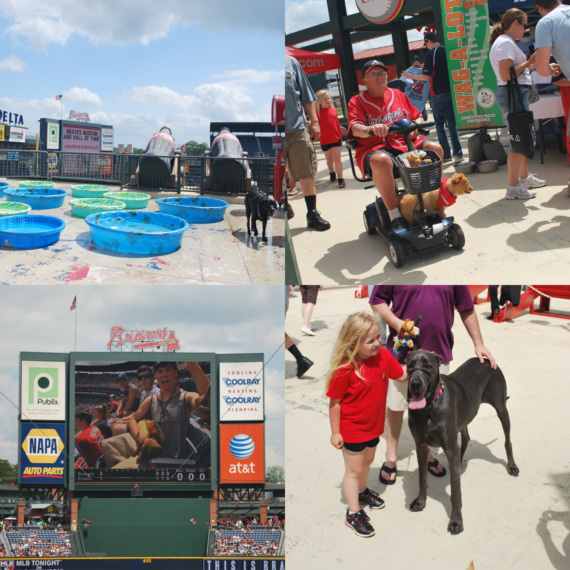 We had time to kill, and it was Bark in the Park day!!! Annette and Dave have two dogs, who I alluded to in the 4-13-12 post. Annette had badly wanted to bring them, but decided otherwise. One of their dogs is somewhat skittish, and the other gets car sick, so it was probably for the best. We spent a good 30 minutes in the area that is reserved for the dogs and their owners. The Braves have a special entrance and everything, and the dogs have to stay in that area for the whole game, so it’s not like there were dogs everywhere. I took a bunch of pictures and below is a four-parter that shows what all went down.