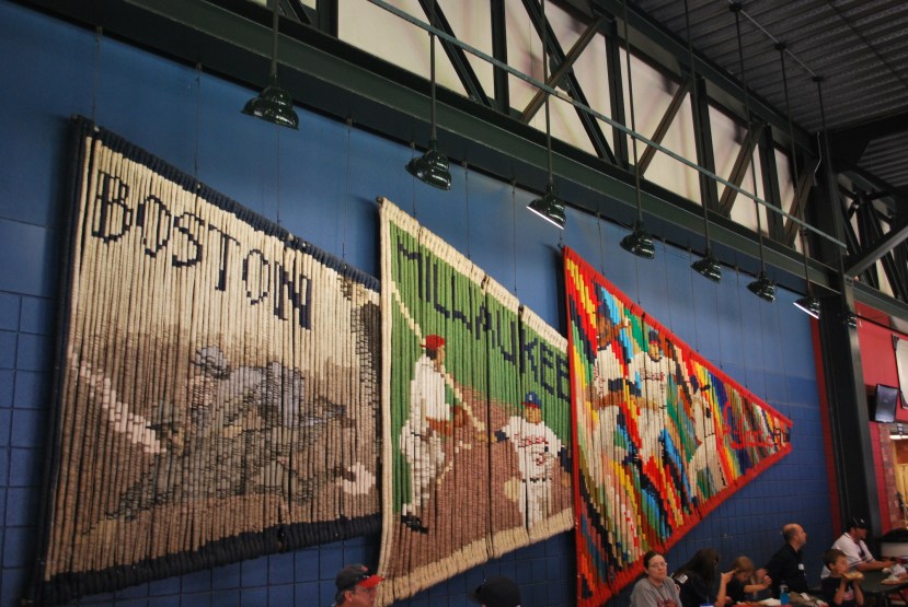 On my way to my seat I came across a wall in the second level concourse that commemorated the three cities that the Braves franchise has played in; Boston, Milwaukee, and Atlanta. When they were in Boston they actually started as the Red Stockings in 1871, then the Red Caps, Beaneaters (my favorite), Doves, Rustlers, and finally the Braves (in 1941). I’m not sure what the giant pennants were made of, but I’m guessing wool or something similar.