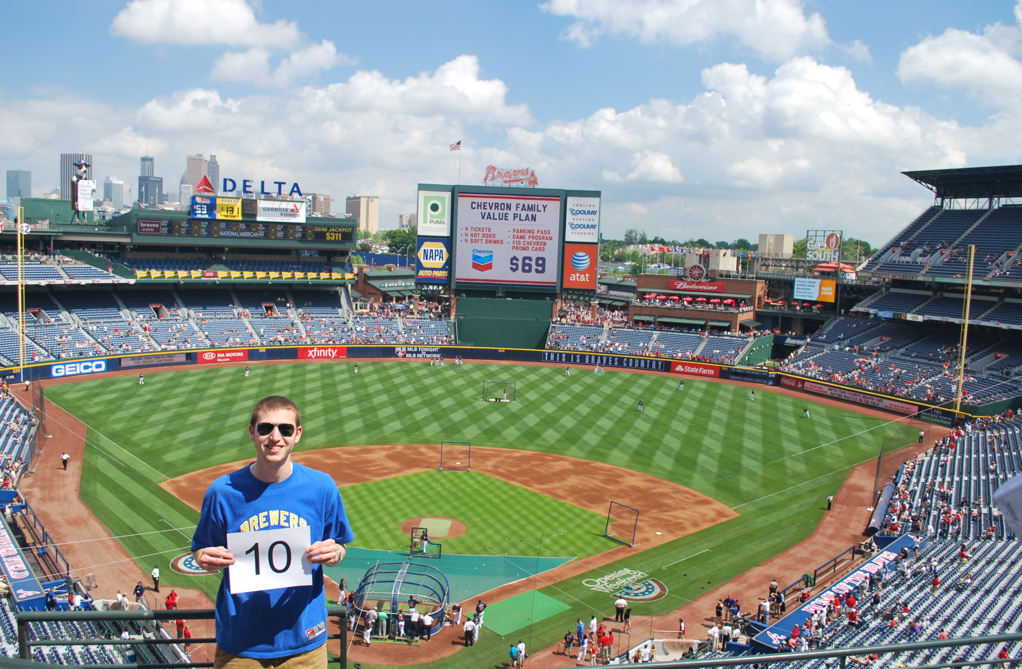 Annette and Dave didn’t want to take the MARTA to Sunday’s game, so the three of us and Bill drove down in Annette’s car for what I thought was a 1:05 game. It actually was a 1:35 game, and I have that in my calendar, so I don’t know what I was thinking. It’s a short trip by car (assuming no traffic), and it only took us 20 minutes or so to get to the stadium. The three of them were sitting in the outfield again, but I was using the ticket the Brewers provided, and had to pick it up at will call. We got to the media will call around 11:45 but the representative said they weren’t available. At 12:00 they were released and we headed inside. We went straight to the upper deck because I wanted to get this: