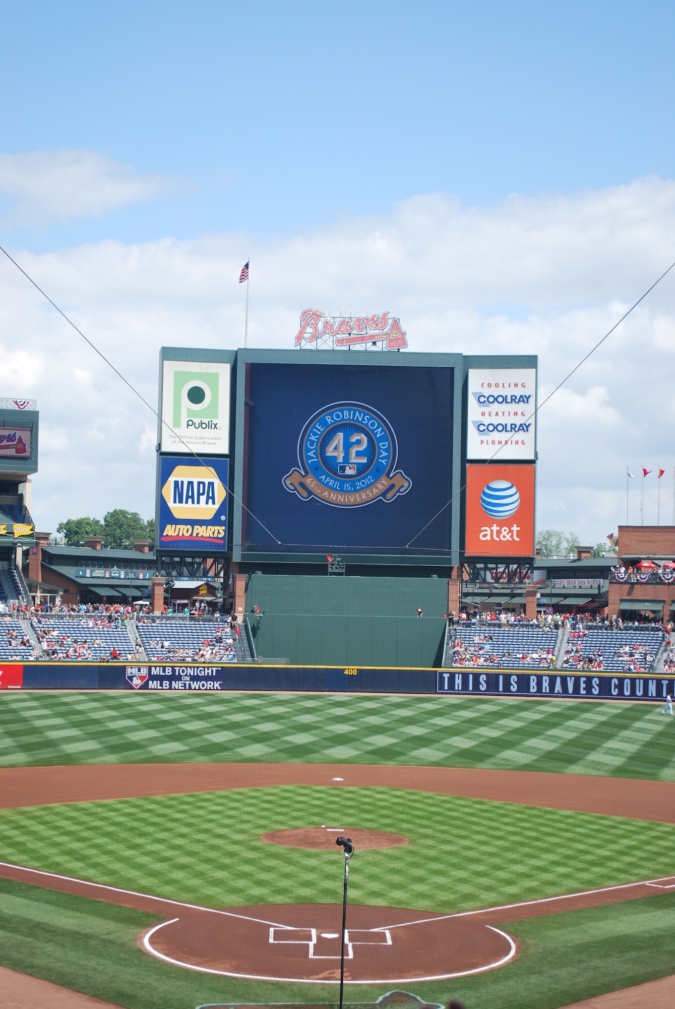 I was in my seat by 12:55 for what I thought was the 1:05 first pitch, I was curious why they were doing some of the things they generally do 30 minutes before the game. I’m an idiot. Before the 1:35 first pitch they showed a video on the board commemorating Jackie Robinson breaking the color barrier 65 years ago. I thought it would have been a longer video, but it was just some footage of players, with someone saying, before Kemp, before Aaron, before Mays, there was Jackie. They listed more players than just the three I mentioned, but that was the gist of it.