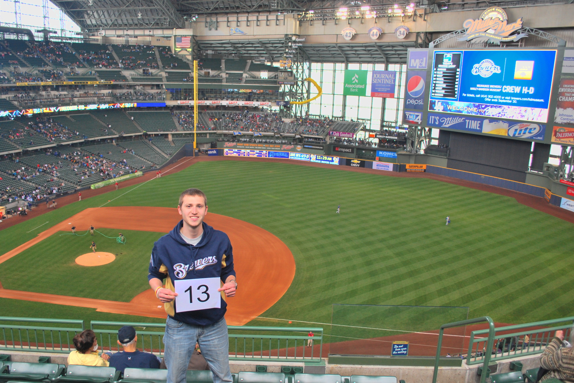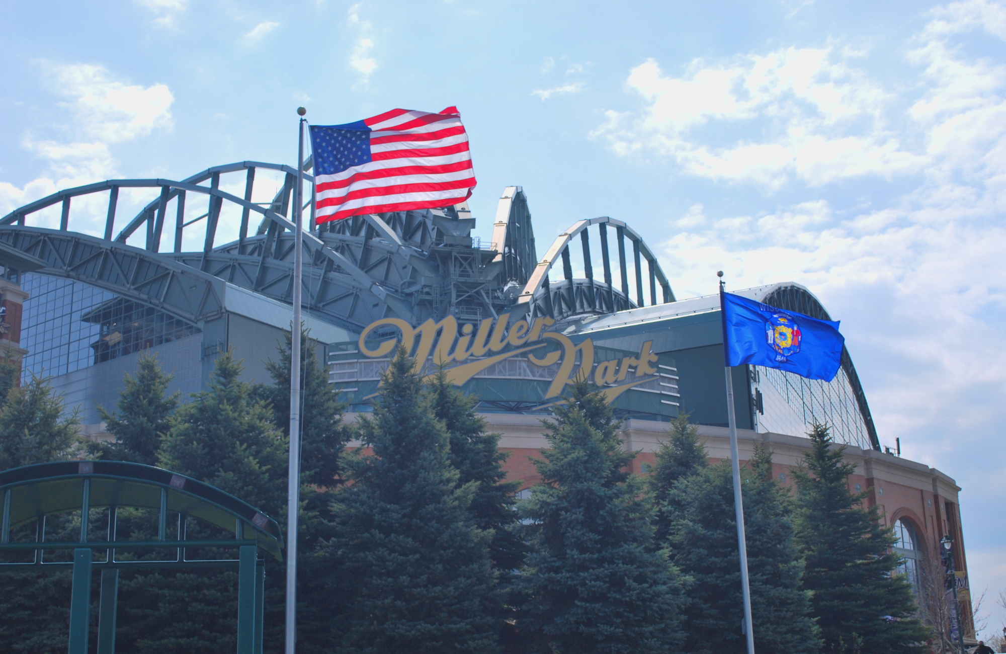 Last night was a late one, as I didn’t get home until 11:30 pm, and was up until two in the morning finishing the blog post for yesterday’s game. It was a really quick turnaround as the game today was at 12:10. I got up at 8:45, ate breakfast, and then had a 30 minute phone interview with Doug Moe, a columnist for the Wisconsin State Journal. I’m not quite sure when his column will run, but I think within the next few days. I quickly showered and was on the road by 10:10. Traffic was decent and I got to Miller Park with plenty of time to spare, at 11:09. This first picture says it all; AMERICA! BEER! BASEBALL! TREES! and WISCONSIN! I have to give credit to the wind for making the picture possible, without it the flags wouldn’t have been “up” for the photo opportunity.