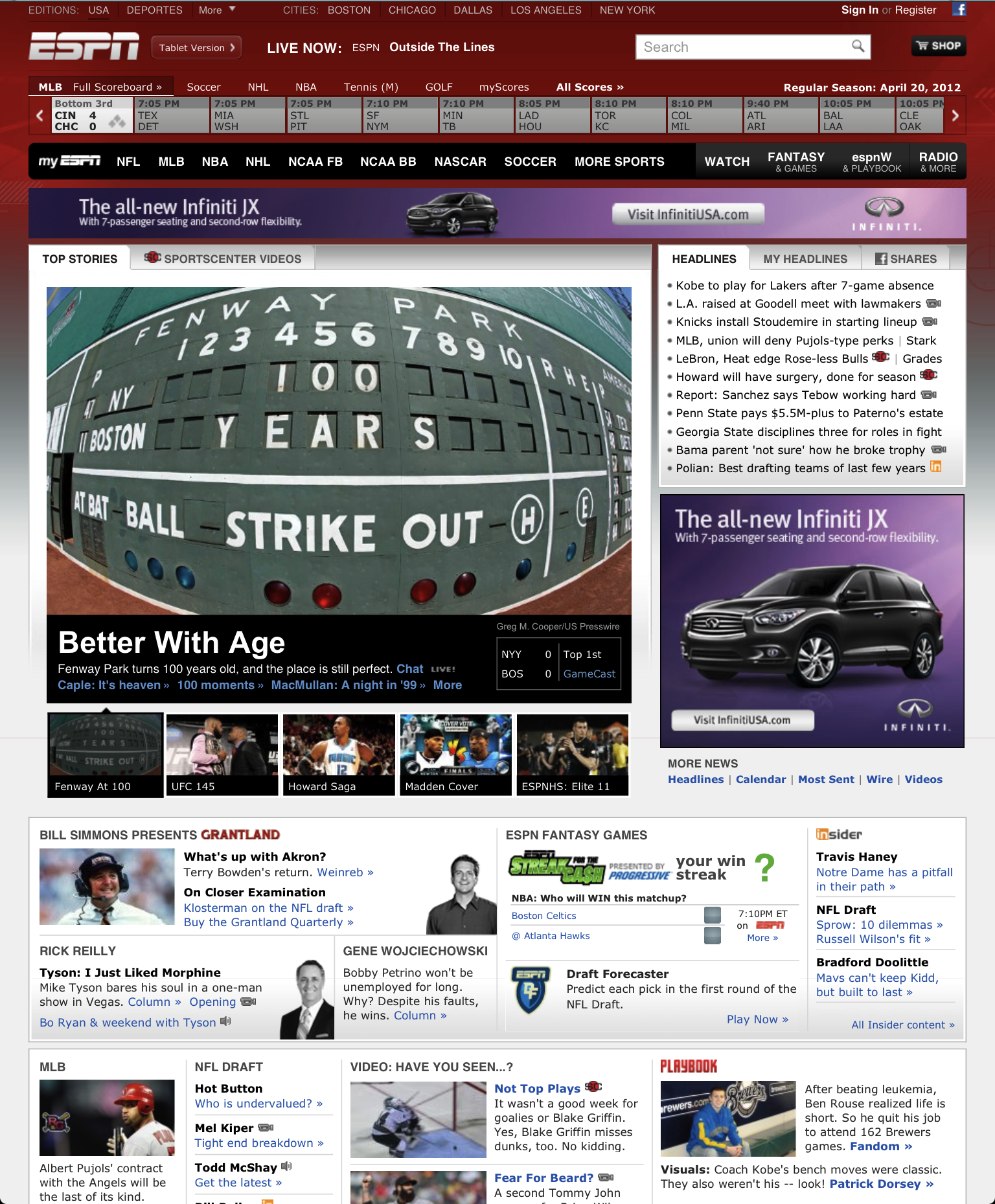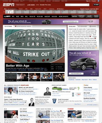 Victoria will be joining me for Saturday and Sunday’s games. We’ll be staying with her Aunt and Uncle, who live in Sussex, allowing for some more sleep between the two games. I almost forgot; the column stemming from the interview I did with Matt Lindner on April 9th at Tribune Tower in Chicago is/was on the front page of ESPN.com!!! I took a screen shot because I wasn’t sure how long it would be there (it’s in the bottom right of the image below. As of 2:03 am on Saturday morning, it was still there. You can get to the article by CLICKING HERE. It’s just crazy seeing MY NAME on the front page of the website, next to talk of Brian Wilson needing a second Tommy John surgery.