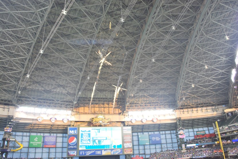 Between the top and bottom of the first the Brewers try to get everyone excited for the first at bats for the home team. At the end of a short video montage they shoot off fireworks over the scoreboard in center. When the roof is open they fire them more skyward, but it’s still fun when it’s closed. In addition to the ones you can see below, they also fire off some sort of apparatus that sounds like canon being fired. If you’re sitting in the right field bleachers and you don’t see the fireworks going off, it can sometimes be quite startling to hear the booms of the fireworks that don’t produce any visuals. I’ve jumped a few times when sitting over there.