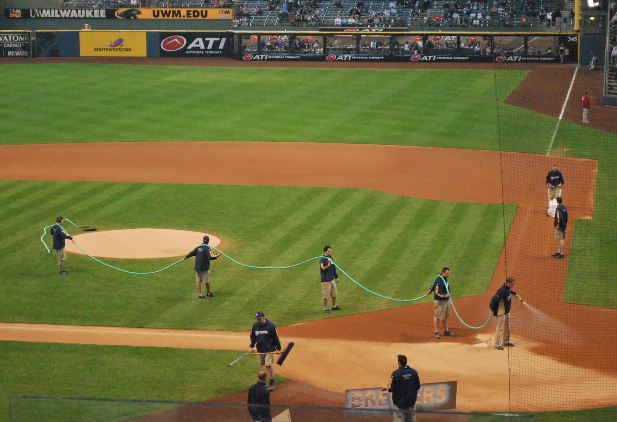 For those not too familiar with the upkeep and care for a baseball diamond, they water the “dirt” to keep it soft and not as dusty. I put dirt in quotes because it’s not really dirt, it’s a combination of sand, silt, and clay. Watering the infield wasn’t done very often, if at all, at the little league diamonds of my youth. As a result, sliding into a base could be a very painful experience. The ground underneath the top layer of sand dries out if it doesn’t rain very often, and it becomes pseudo-cement rather quickly.