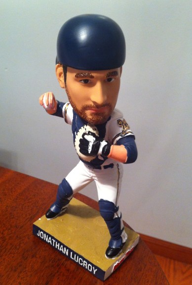 This one appears to be of higher quality than in past years, and the face looks just like Lucroy, something that can’t be said about a lot of bobbles. I think they may have started paying the workers more, because the paint job appeared better than previous bobble heads. I took out my Zack Greinke bobble from last year, and Lucroy’s did seem a little better. The duration of head bobble favored Greinke though, and it wasn’t even close. I don’t know if they started using more rigid springs this year, but I timed how long it took for the bobbling to come to a complete stop, after giving each head an equal twist. Final score: Greinke 50 seconds, Lucroy 5 seconds. I was blown away. It could just be that Greinke likes shaking off signs, and Lucroy doesn’t like saying no.
