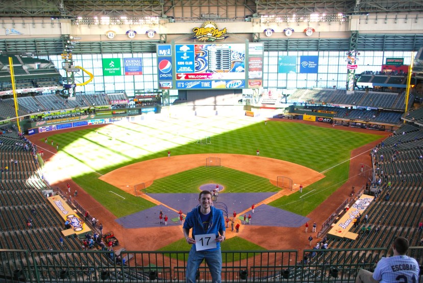 I left Fort at 4:15 and made it to Miller Park by 5:25. I met Larry Granillo, who contributes to Baseball Prospectus, outside of Miller Park, and went inside right after the gates opened. Larry is going to be writing something for the website, and I agreed to go to a game with him and let him pick my brain about my mission. We went to the upper deck, to get what should be the middle picture of all the upper deck game number photos.