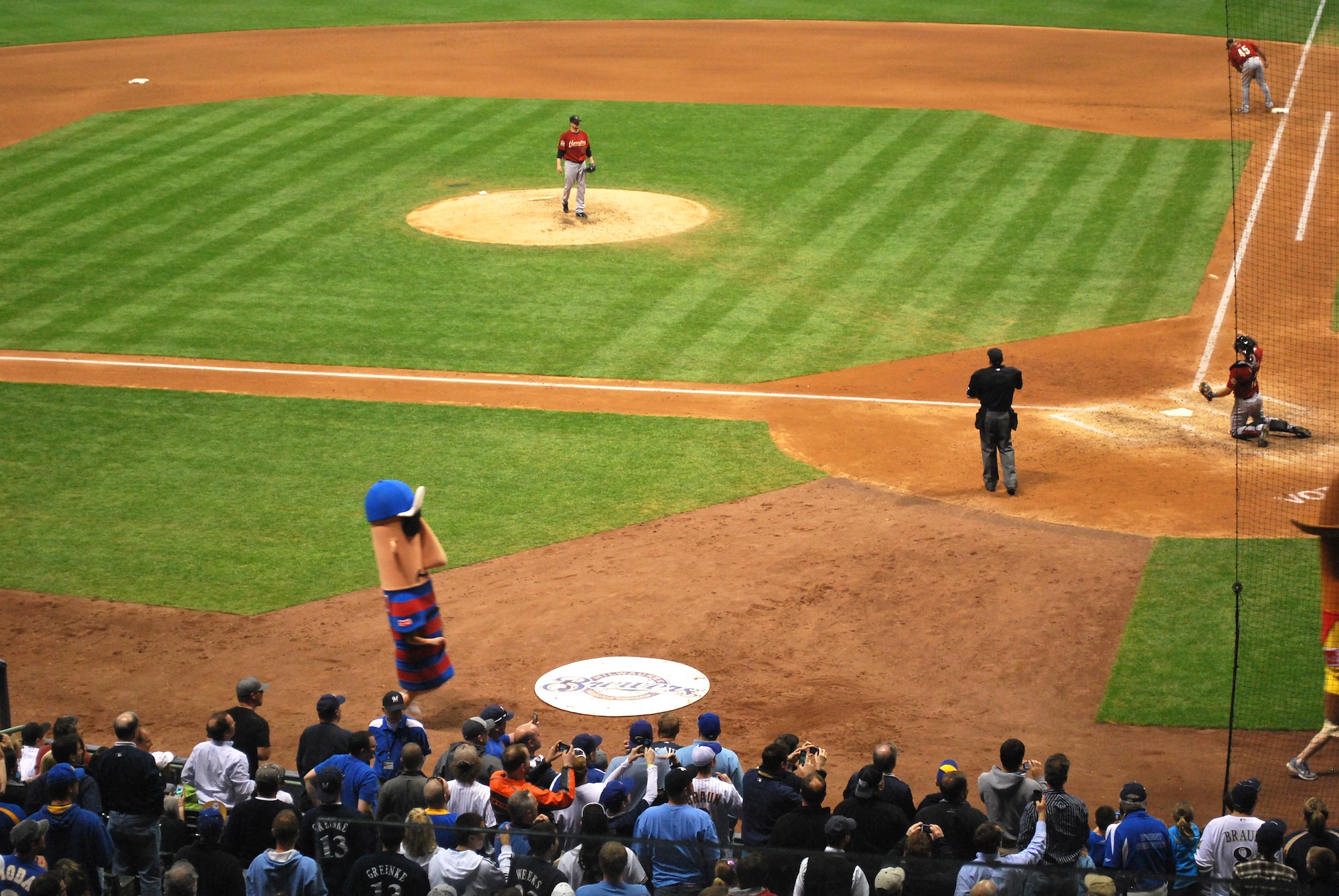 We got to our seats with 30 minutes before game time, and talked about baseball, my mission, and how I’m going to make it all work. Larry actually made me a little nervous about possible rainouts and make up games. I already knew that this was possible, but hearing someone else talk about it makes me a little uneasy. We were looking at the Brewers pocket schedule and discussing how I was going to make each trip happen. We noticed that the Brewers end the season with 39 games in 41 days! And that’s without any possible makeup games on either of those off days. “It’ll all work out, it’ll all work out” is what I keep telling myself.