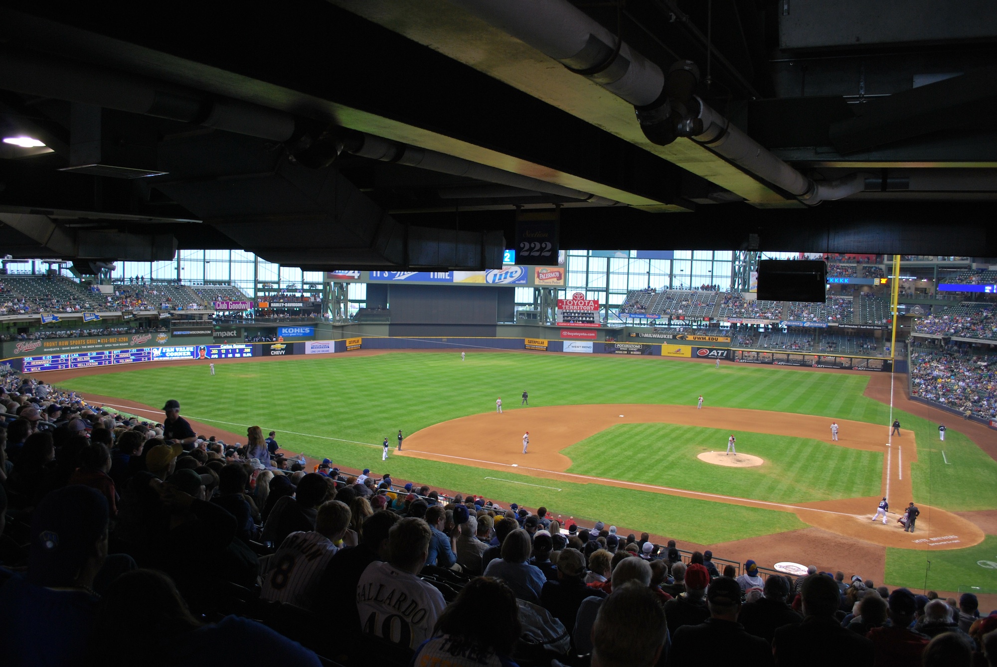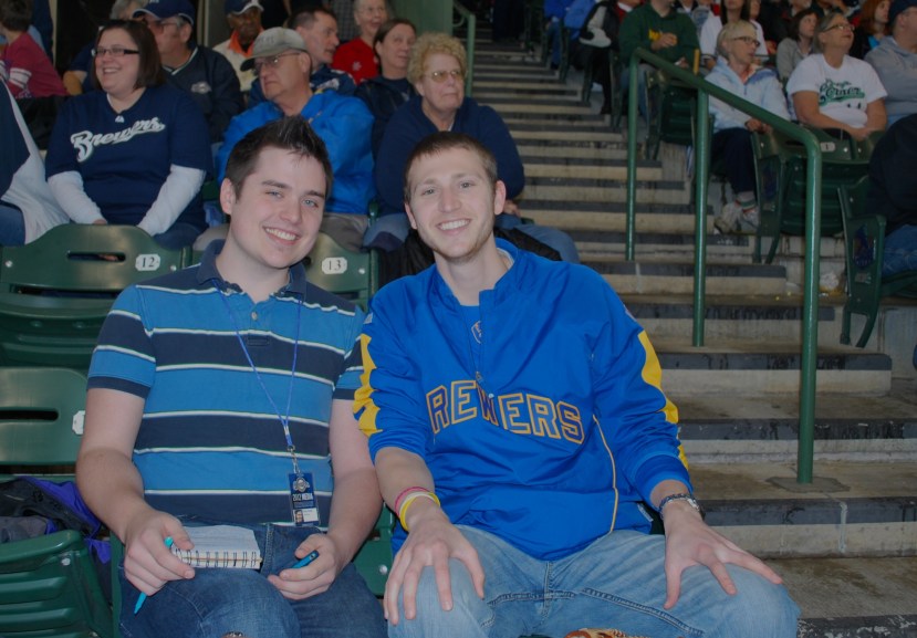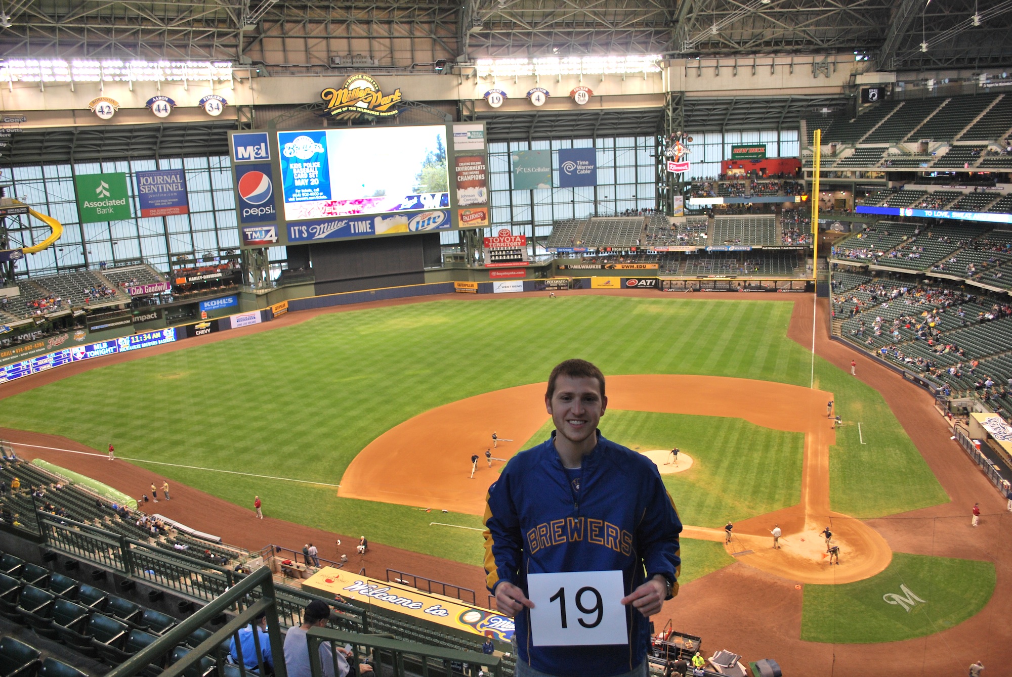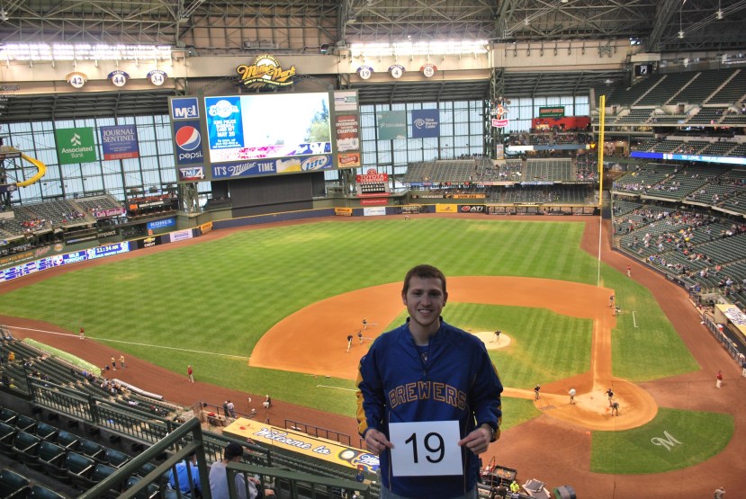 While talking with one of the receptionists after my appointment, and trying to figure out how everything would work, she asked how I was doing with all the travel and whatnot. I started to answer “Well, there’s only been 18 games……” and then realized I hadn’t changed out the game number sign from last night. I know it’s not a huge deal but I beat myself up a bit. Since I was only in Fort, and my parents live 7 miles away, I decided to go back and get it, then head to Milwaukee. I had originally told Ryan Kartje, a writer for FoxSportsWisconsin.com, that I would meet him at eleven, but I wasn’t quite able to make that happen. I still made it into Miller Park by 11:20, and we went right to the upper deck.