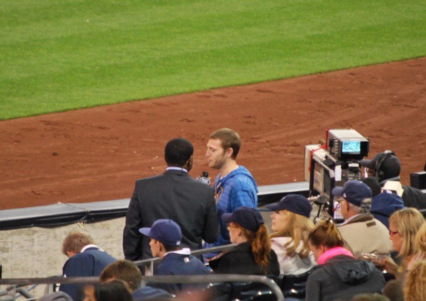 Telly Hughes, the Fox Sports Wisconsin in-game personality, called me earlier in the day and said they’d like to do an in-game interview with me. I had discussed this with the Brewers before the season started, but this was the first one we were doing, save the pre-game interview on the field at Wrigley on April 10th. I went down at the end of the third, and talked with Telly during the top of the fourth. Once the FS Wisconsin broadcast came back from commercial break we talked briefly about what Brewers Mission 162 means, and what I’m raising awareness for; The Be The Match Registry!!! I think it went well, and my phone was blowing up for the next few innings with well wishes from friends and strangers alike. Victoria snapped a picture when I was on air, it’s a little blurry, but with the low light up in our seats, it’s to be expected. My eyes may be closed in the picture below, but I assure you they weren’t closed for the entire time I was on air.