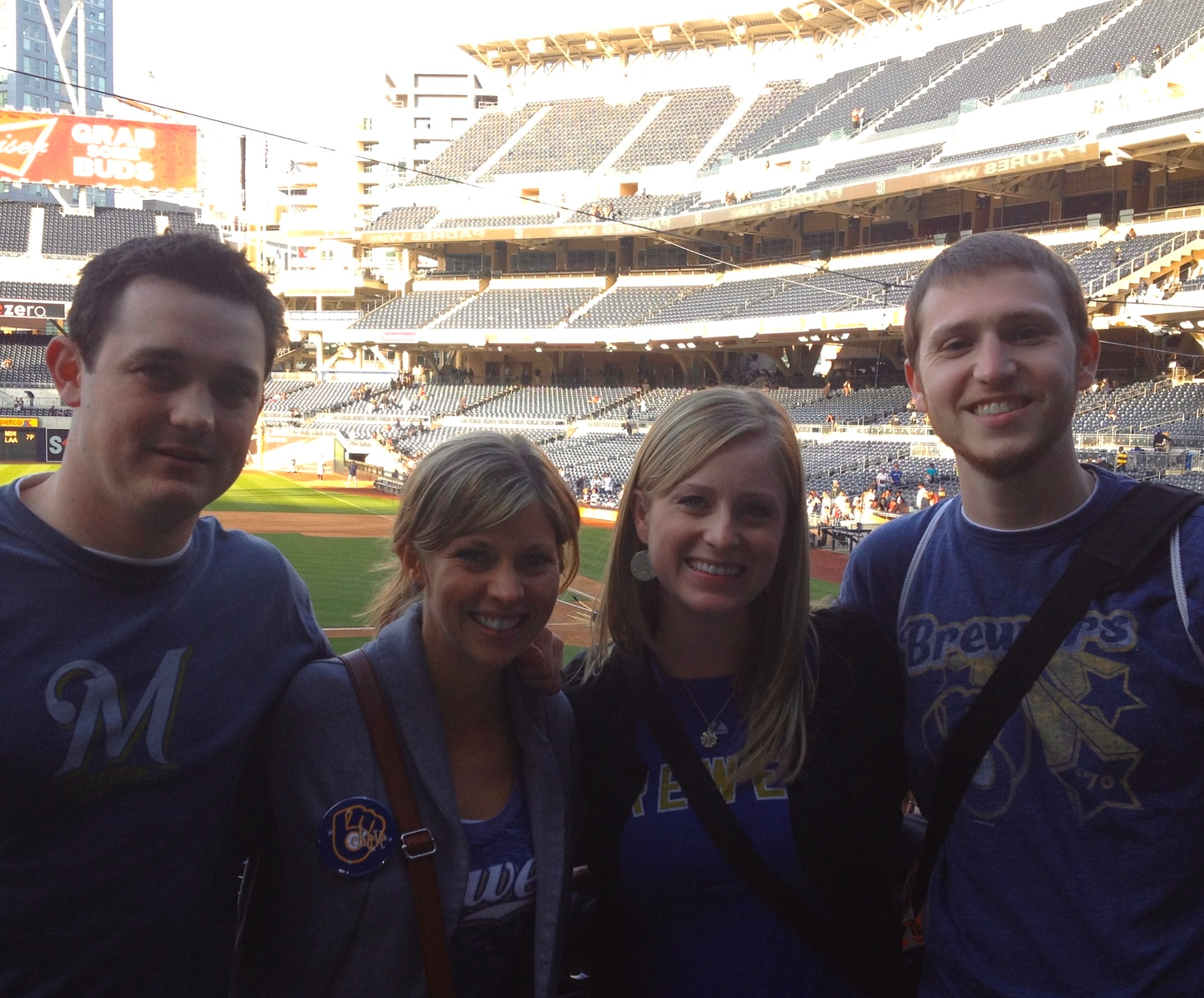 A cousin from my mom’s side had contacted me on Sunday, and said she and her husband would be out in San Diego, and were planning on going to the Wednesday game. They had to pick up a late arriving friend from the airport on Wednesday, and made it to the game as the game was starting. In the seventh inning Annie and Chase stopped by and sat next to Victoria and I for the remainder of the game. Annie is one of my 19 cousins on my mom’s side (my mom is one of 12). Annie and Chase live in La Crosse and I hadn’t seen them since Christmas time, so it was nice to catch up. We had another fan take a picture of us after the game. From left to right it’s Chase, Annie, Victoria, and myself.