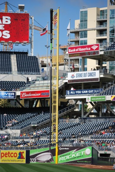 2) The view from the Park at the Park area (way) beyond the right centerfield fence. The Padres sell tickets for out there, and they cost between $5 and $8.50, depending on the game. You might need your binoculars, but you’re still technically a paying a customer, they have a video board on the back of the batter’s eye, and you can see it on the right side of the picture.