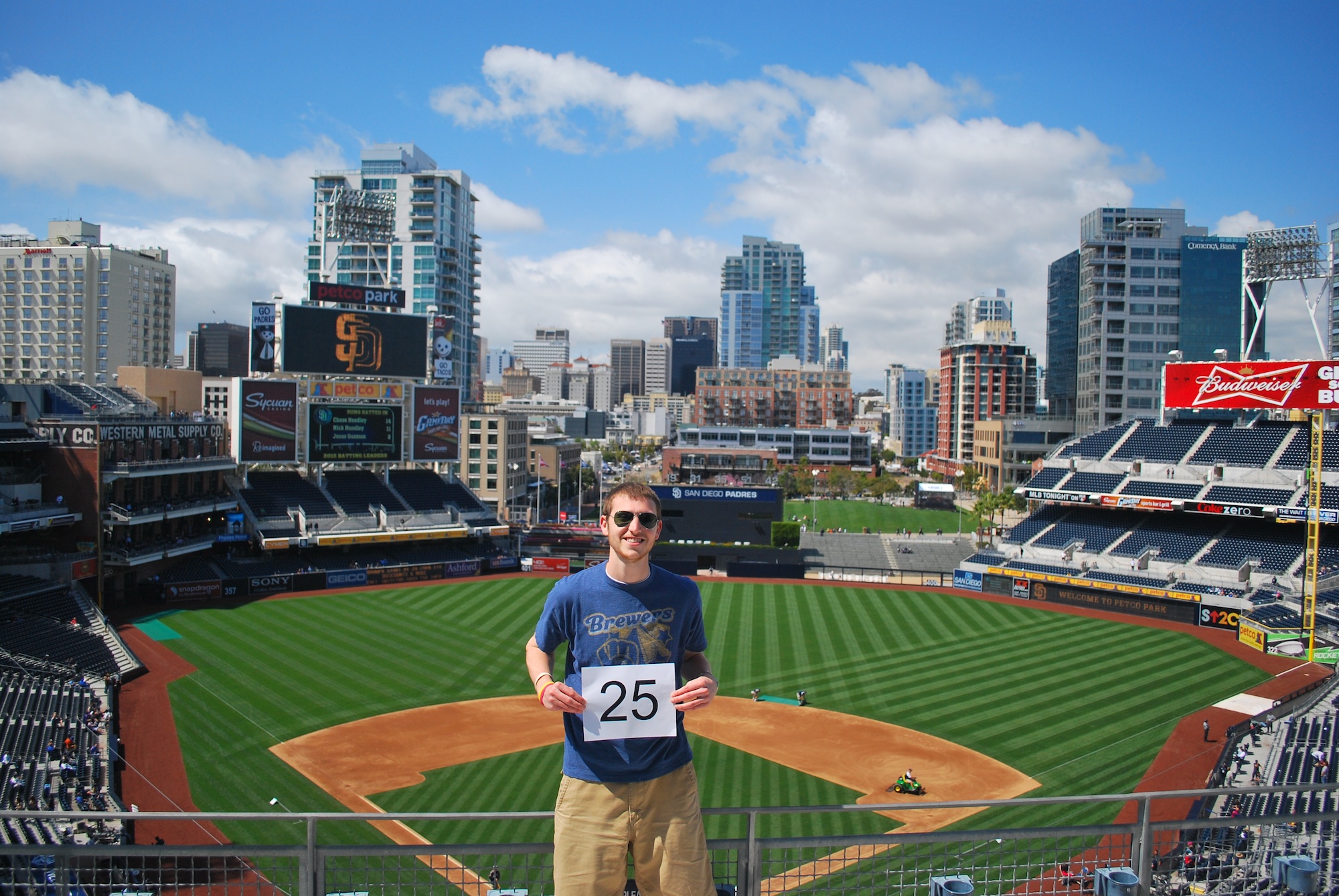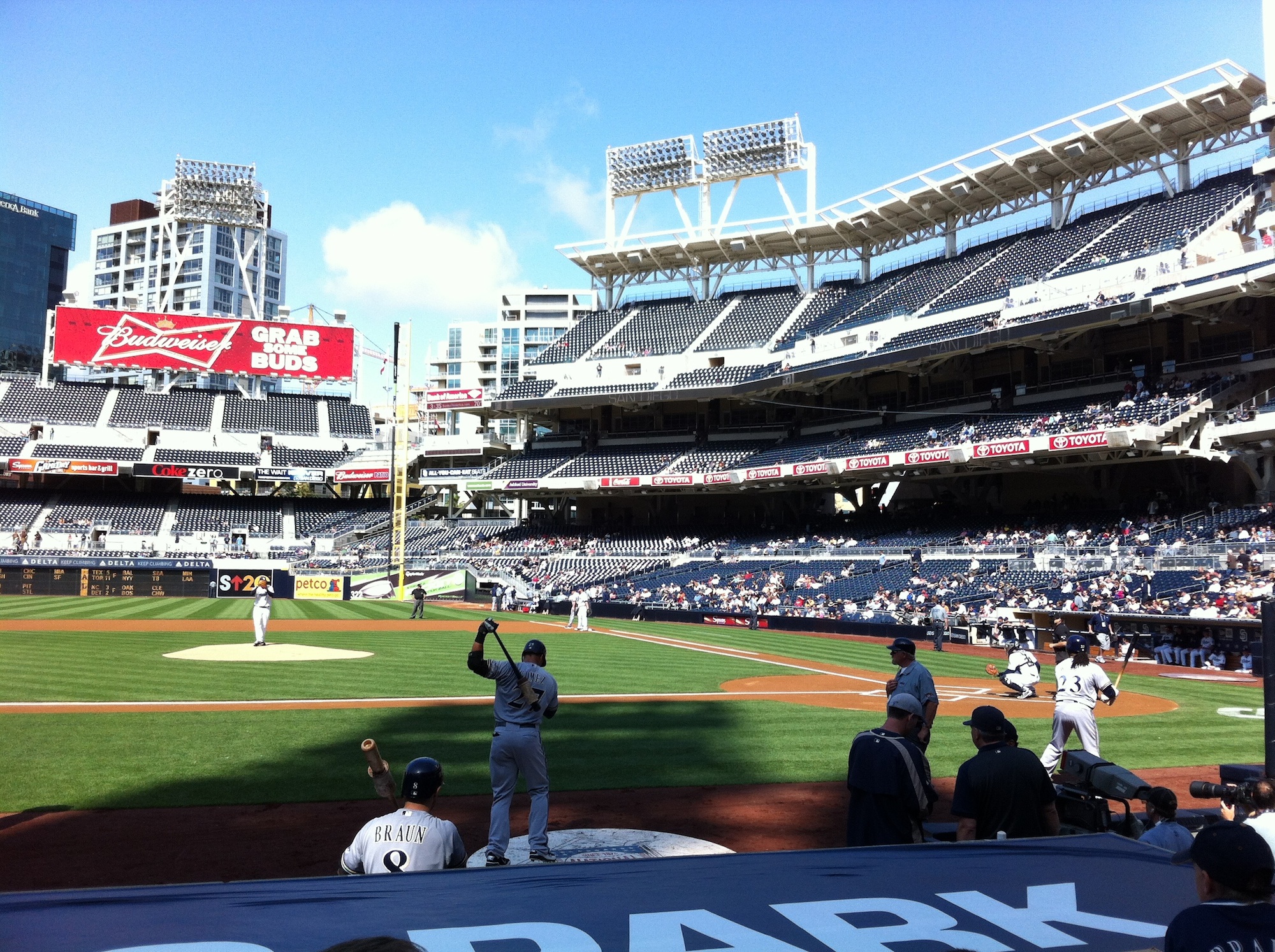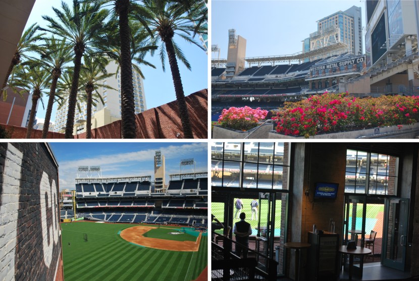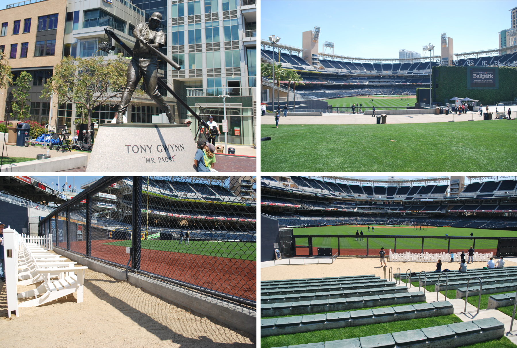 We left the the restaurant at 1:50 and headed towards PETCO. Even though the previous two days had worked with me picking up the Brewers-provided-ticket, and then buying one for Victoria, we wanted seats that were a little closer. Tickets that were in the third row behind the Brewers dugout were still available an hour and a half before the game, nice. After getting the tickets we went inside, walked around, and I took pictures. Since we entered at one of the outfield entrances, I took some pictures in that area. Below, going clockwise from top left: