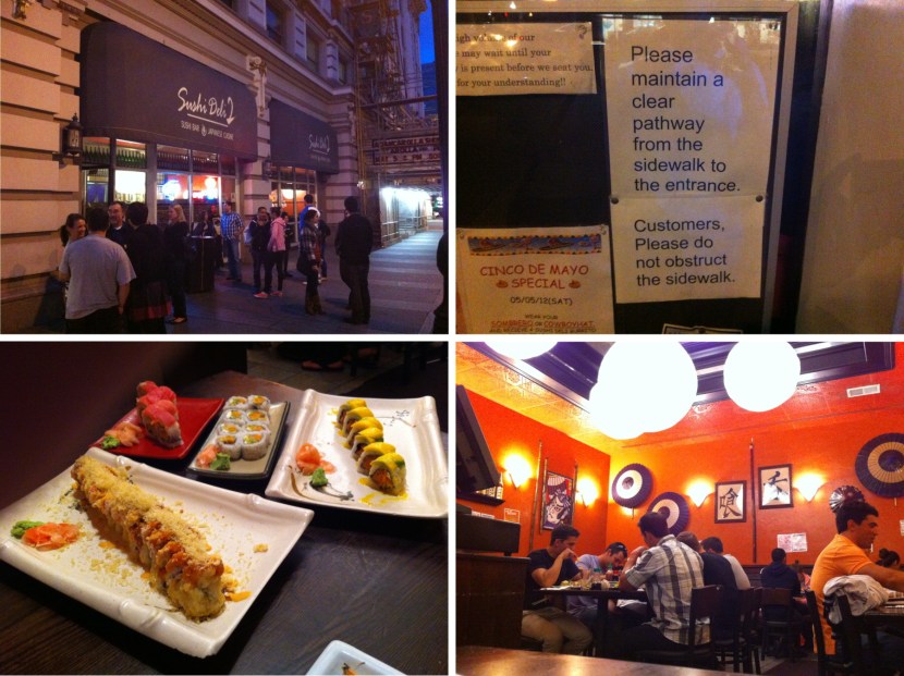 1) The outside of Sushi Deli 2, which is located on Broadway, between 1st Avenue and Broadway Circle. As you can see a gathering of people has formed.