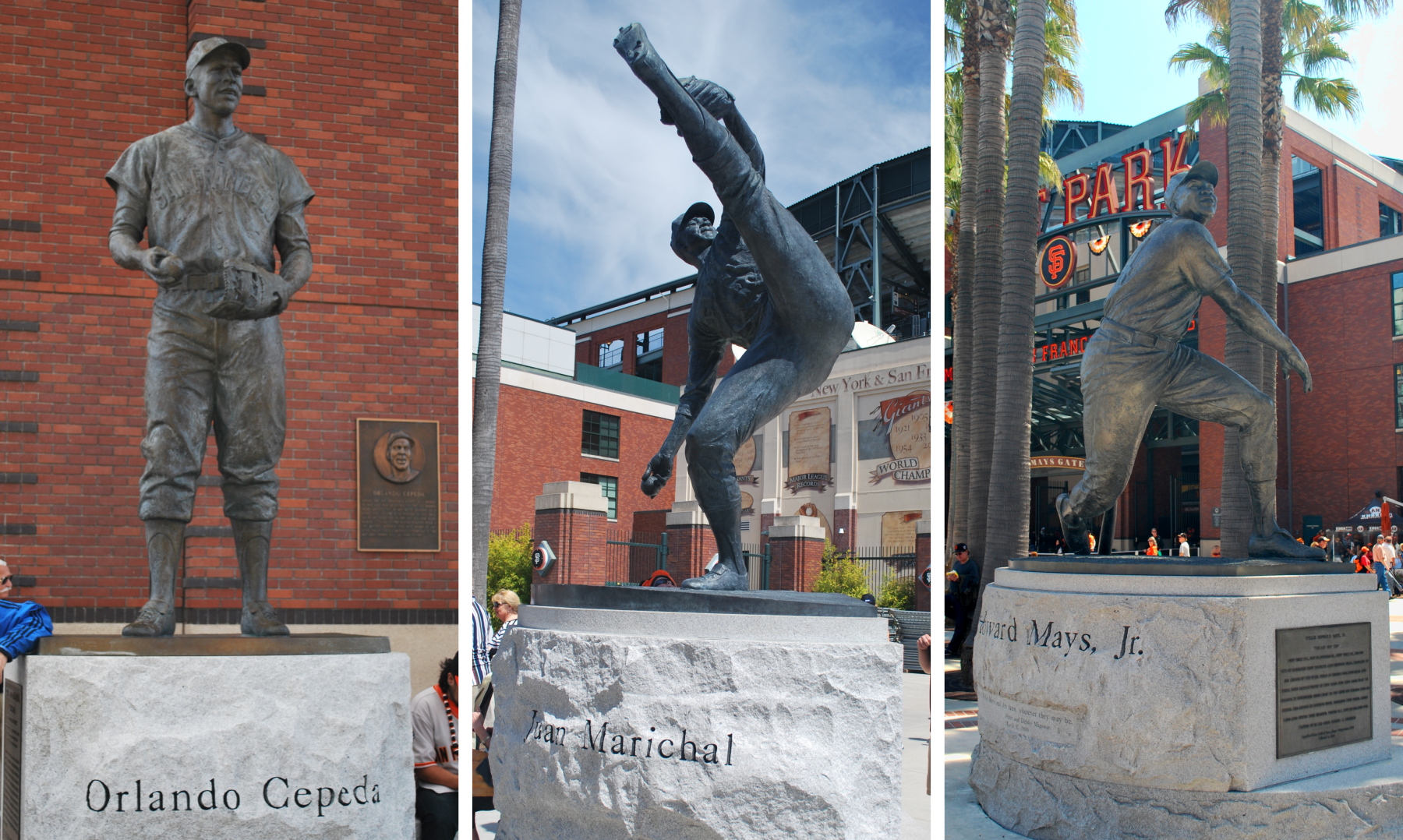 There are three statues outside of AT&T Park. There’s actually a fourth, Willie McCovey, but it’s on the other side of the cove, and I forgot to get a picture of it. From left to right you’ve got Orlando Cepeda, who played for the Giants from 1958-1966, Juan Marichal (1960-1973), and Willie Mays (’51, ’52, 1954-1972).
