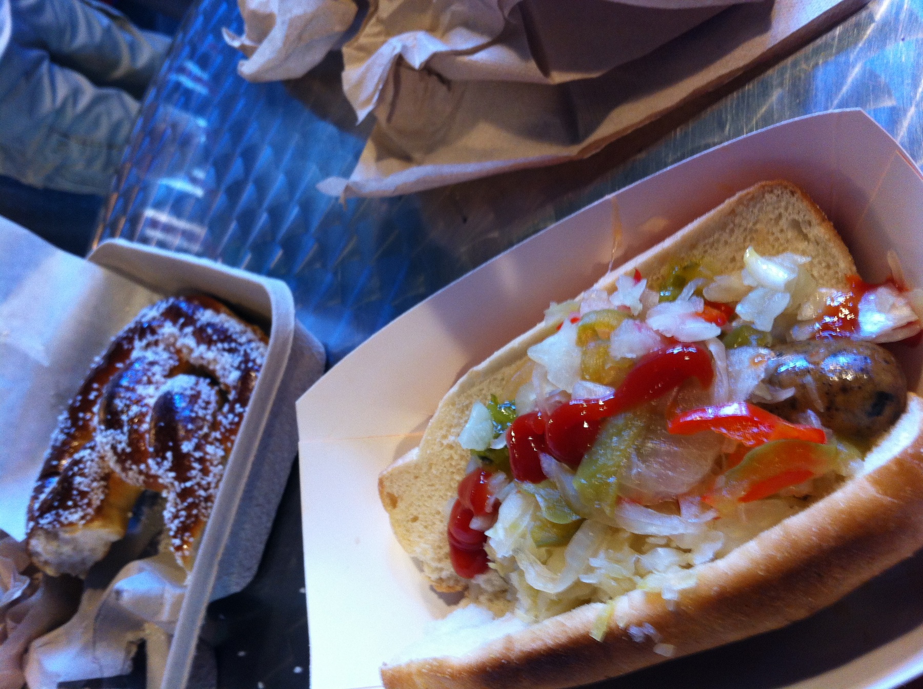 We were inside the park by 12:06, and had an hour before the game started. We walked around in search of something that sounded good for lunch. I figured that I should have something more healthy than a half pound polish again, and I settled on the Chicken Apple Sausage. Bad decision. It may look good below, but I just wasn’t feeling it. I don’t know if it was all the toppings combined with the unique taste that made it taste bad, but I considered not eating the rest of it. Since it had cost me $6.50, I finished it, but I wasn’t happy. Victoria had a pretzel, which is also shown below, but they put on WAY too much salt, so she brushed off a lot of it before eating.