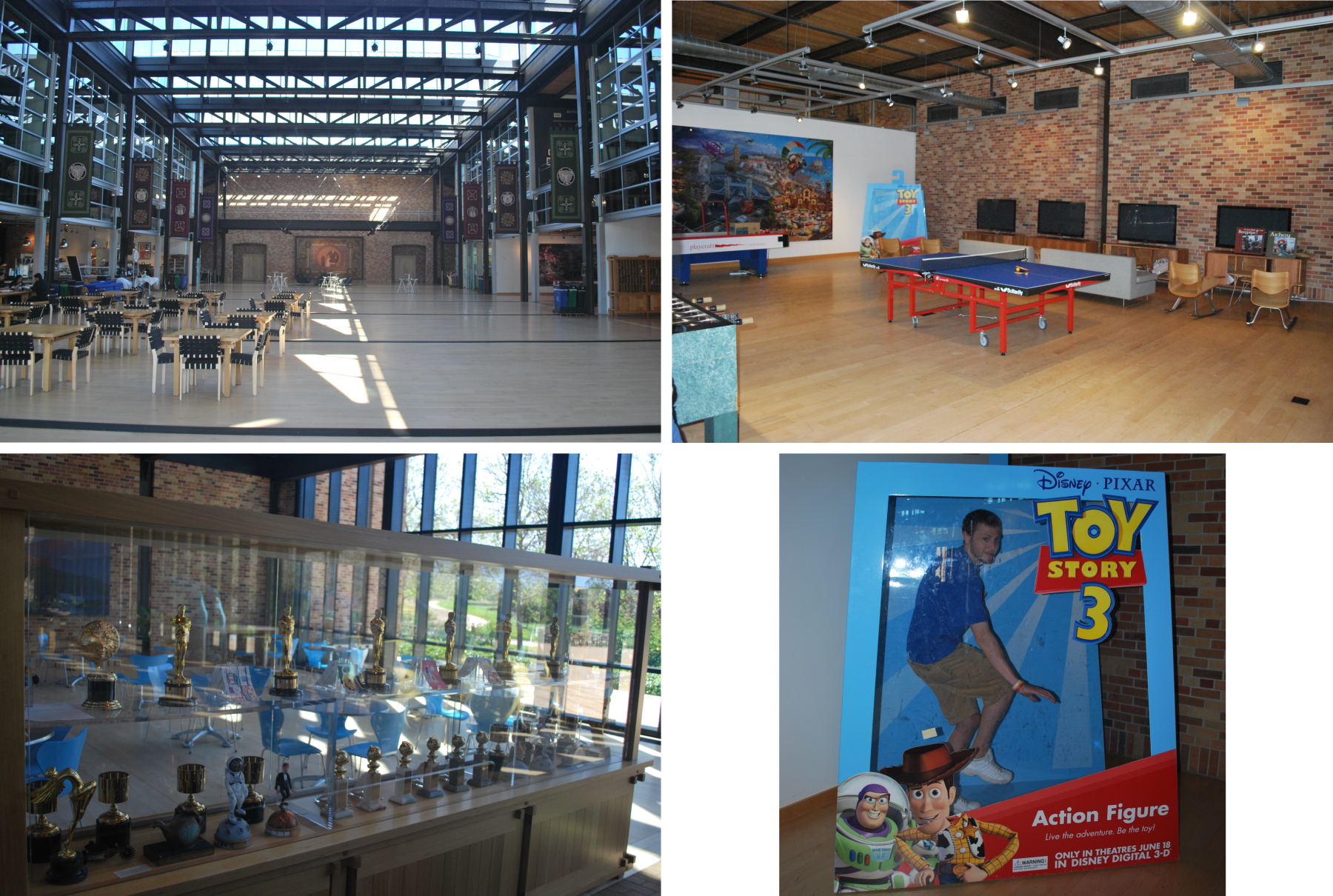 Behind where I took the picture of the Pixar lamp and Luxo Ball is the entrance to the main building on the campus, and it houses most of the offices. Clockwise from top left: