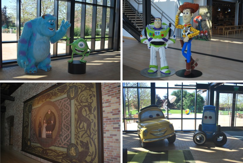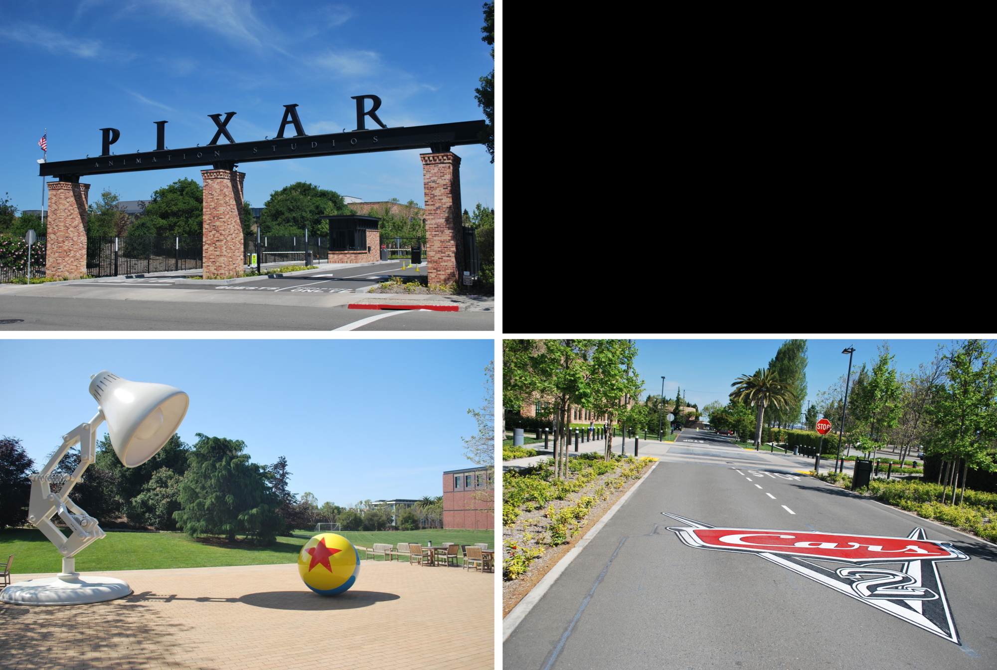We got to Pixar at around 10:15, and I was pretty excited. Going clockwise from top left, the four part picture below contains stuff that can be found outside the buildings at their campus.