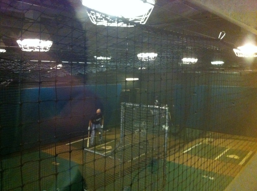 It was kind of weird how we got to our seats. We went down one of the aisles, and then when we got down far enough someone checked our tickets, and we went up a tunnel. In the lower level concourse, we saw the people that were going to be doing something on the field. It just didn’t seem like we were supposed to be down there. They also built this into the stadium, it’s the visiting team’s batting cages, I’m not sure if they have the same thing on the third base side for the Giants. I know the picture quality is kind of bad, despite how bright the lights look, it was kind of dim, and the windows were very reflective. Brooks Conrad was taking some hacks off of a tee. Rickie Weeks was in there as well, but I don’t think he’s visible in the below picture.