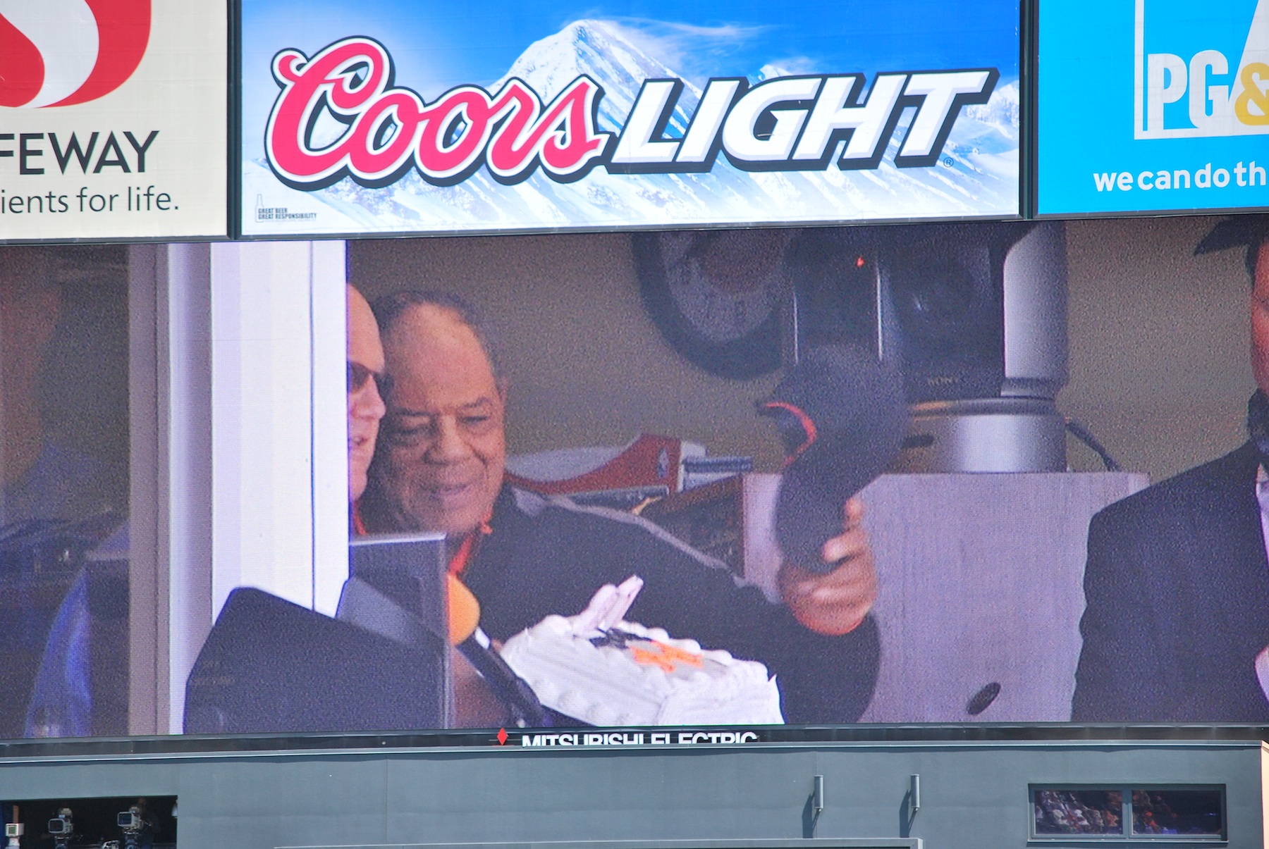 It also happened to be Willie Mays’ 81st birthday, and they celebrated by having everyone sing Happy Birthday to him. He was presented a cake in the press box, alongside Jon Miller, and they showed him on the jumbotron. It was a special moment.