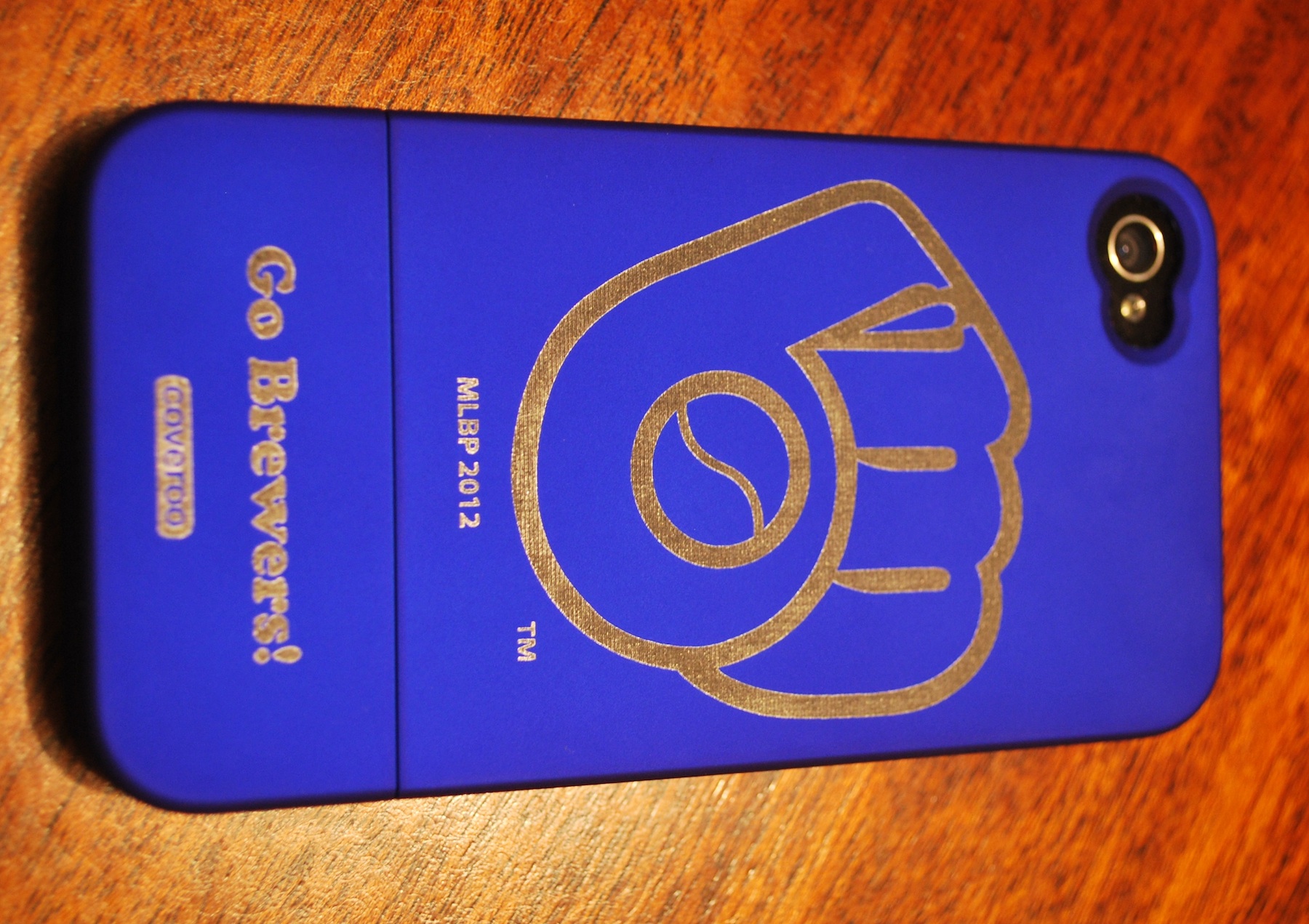 Crandall and I walked down to section 115, because I was going to be meeting up with a few people. We didn’t see them, and as we were walking in the cross aisle we crossed paths with Jill Aronoff, the Brewers director of merchandising. I’ve mentioned her before, and she has helped pass along the licensed merchandise that the Brewers are providing. She showed me her phone and said the Brewers now have an etching machine to engrave cell phone cases. She asked if I wanted one and I was really skeptical, since I’m completely satisfied with my iPhone 4 “bumper”. Since we didn’t see the guys I was meeting up with, I agreed to head to the team store with her and Daniel, who works for Coveroo, the company that makes the engraving machine/software. It’s not just for iPhones, and there are many phone models that are available, I chose the ball and glove logo, and had Go Brewers! engraved in the bottom part. This picture below shows the machine in action.