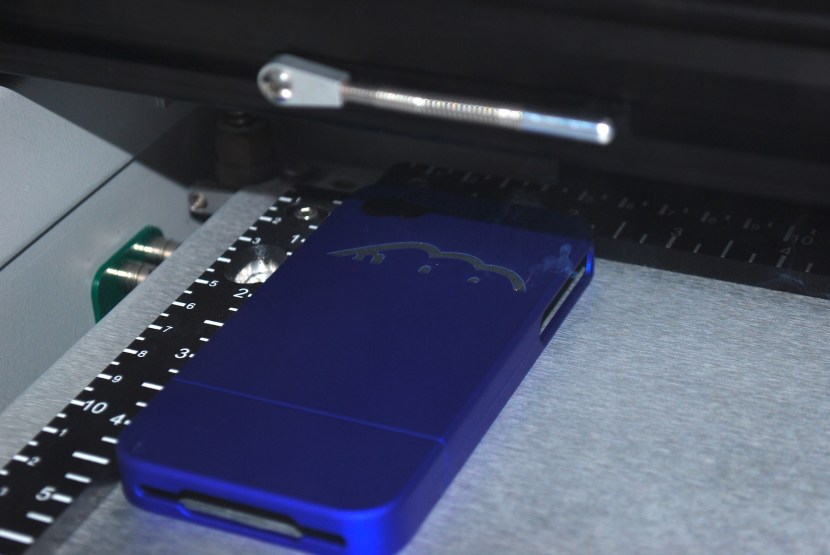 You can’t see it, but it’s using a laser to burn off the top layer, which exposes the silver layer underneath. You can see the little bit of smoke on the far right of the case, as the laser works its way down. It takes about three minutes, and the finished product is pretty sweet. So if you’re interested in getting a custom made cell phone case, stop by the team store by Friday’s front row, and take a look for yourself. They cost $30, and after seeing the quality of the engraving and the case itself, I think it’s worth it.