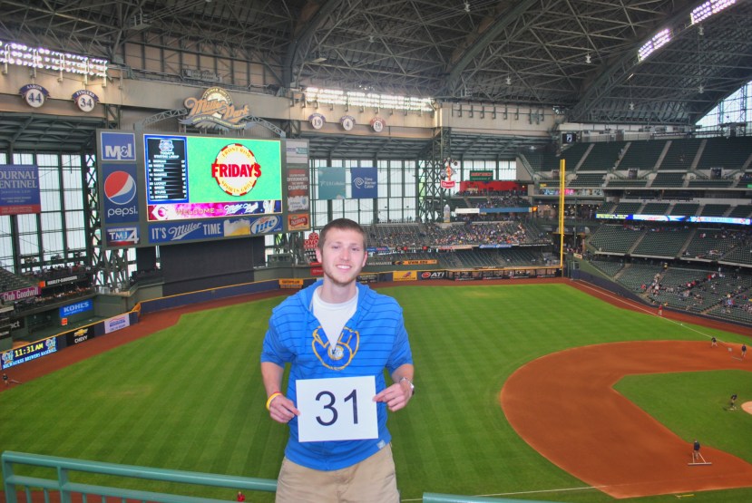 Sleeping until 11:00 am on Tuesday may not have been the best idea. I didn’t fall asleep until after 3:30 am on Wednesday morning, with the day game just nine hours away. I got up at 9:20, and was on the road by 10:10. I pulled into the Cooper lot at 11:15, and made my way into Miller Park. I went up to section 432 and got game photo number 31 out of the way. A couple was sitting nearby and I had the woman take the picture. After saying what I was doing the guy said that he had heard about it, and took a picture as she was taking the picture of me; good stuff.