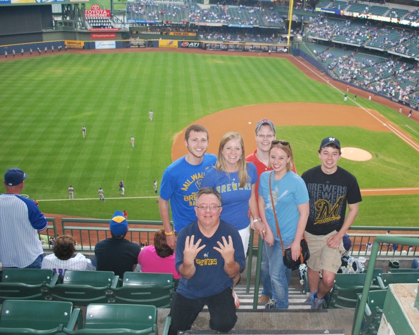 After getting the game number picture out of the way, we met up with Alex and Jess. I stayed with them at their apartment in Chicago from April 9th to April 13th, when the Brewers had a four game series with the Cubs. Alex was born and raised in a Chicago suburb, so he’s a Cubs fan. Jess was born and raised in Wisconsin, so she is a Brewers fan. They both aren’t too serious of fans, so it works for them, I don’t know I could do the same. Jess and her family were at the game, and she has told me recently that her dad is a huge fan of the blog, and actually has it as his homepage. So I have to give a shout out to Dave, a Wisconsinite through and through, thanks for the support and the loyalty. We had a picture taken while we were in the upper deck of the six of us. The back row is myself, Victoria, Alex, Jess, and Matt (Jess’ brother). In front is Jess’ dad, Dave, he’s holding up eight fingers for Ryan Braun’s number (at least that’s what he told us). I hope this also doesn’t double as a gang sign, because then Dave, and myself (by association), might be in trouble.
