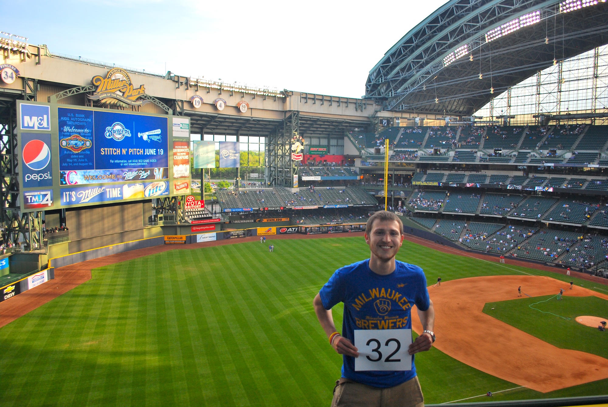 We tailgated until 6:10 and then headed inside so we could get game photo number 32 without having too many people in the way. It worked out well as the row I was in had people on both aisles, but none where I was standing; nice! I forgot to mention in Wednesday’s post, but Kathy Schwab, the Brewers Senior Director of Marketing, who is my main point of contact, stopped by and gave me two new shirts. Thanks Kathy! I wore one for Friday’s game, thus the mention.