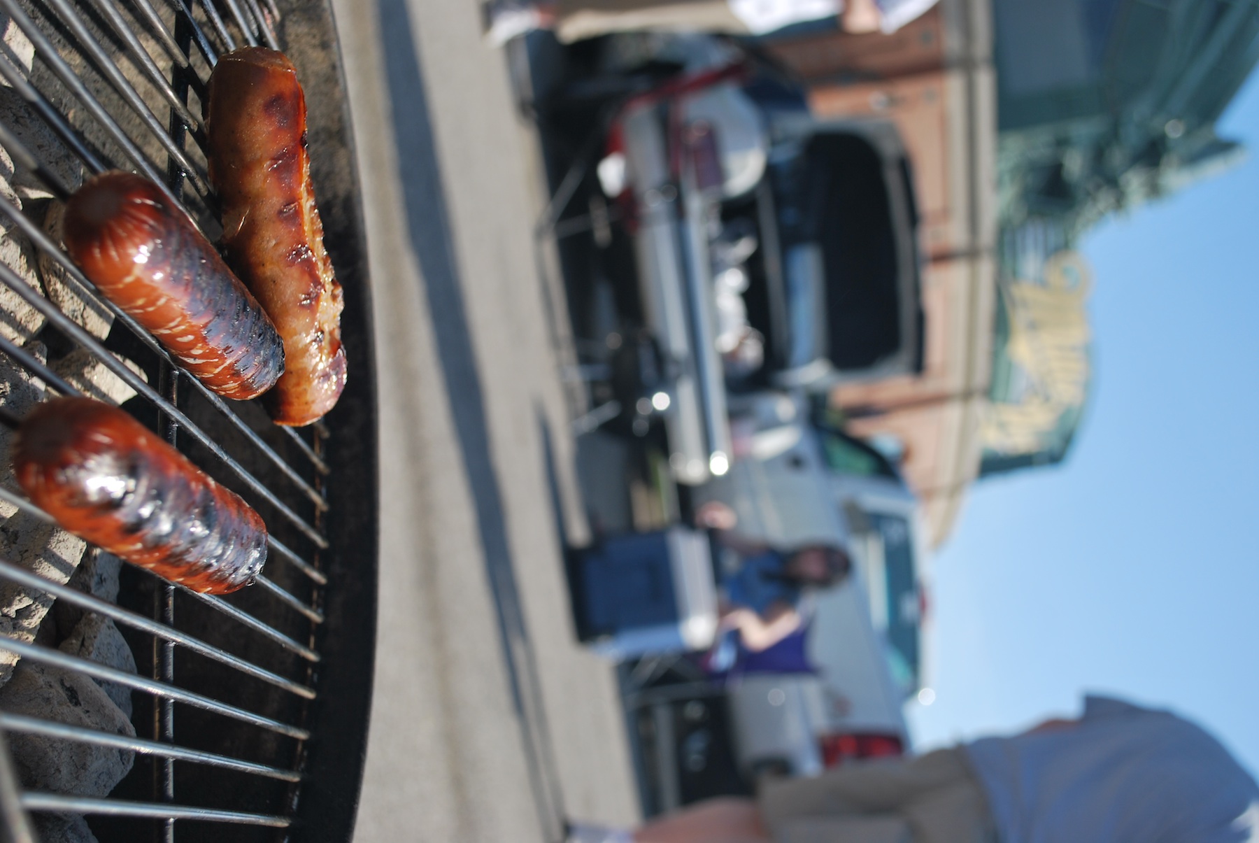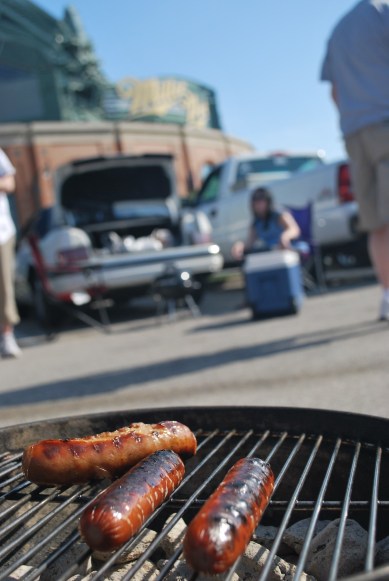 We had Johnsonville Polish sausages and some Oscar Mayer turkey dogs. I wound up eating two polish and one turkey dog, as well as some cole slaw, fruit salad, some wheat thins, and a few beers. I was quite full when we went in for the game. If we could’ve gotten the front row parking spot this picture would have been much better, as is it contains a stranger just glaring at my camera. The bokeh makes her un-identifiable, but it still diminishes a pretty good photo opportunity. Incased meats and Miller Park, it’s hard to beat that combination.