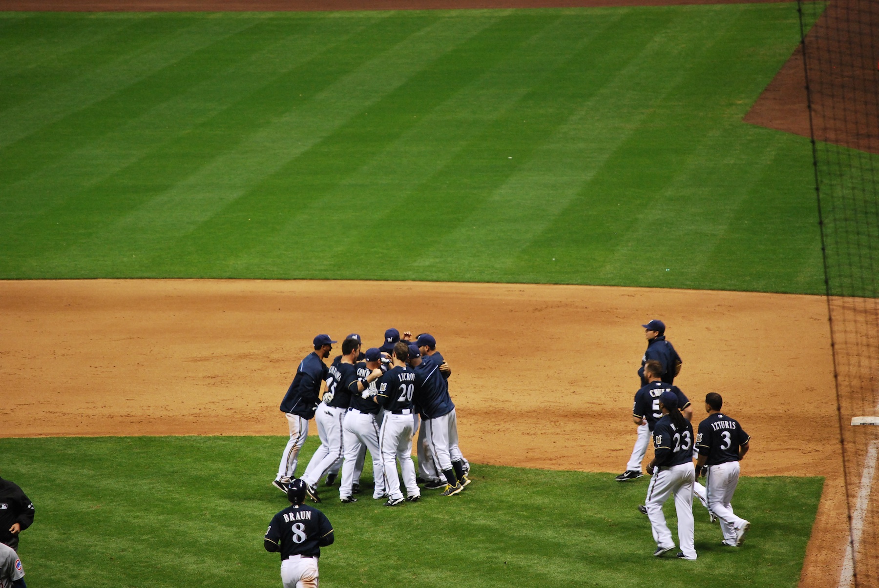 Both bullpens did a great job of keeping it tied, but in the 13th, the Brewers prevailed. After loading the bases with nobody out, Chart came to the plate again, and this time sent a bouncer up the middle that reached the outfield, and Rickie came home as the winning run. Final Score: Brewers 8 – Cubs 7. All the players mobbed Chart after he got to first. It’s hard to beat a walk-off, especially when it’s at 12:14 am.