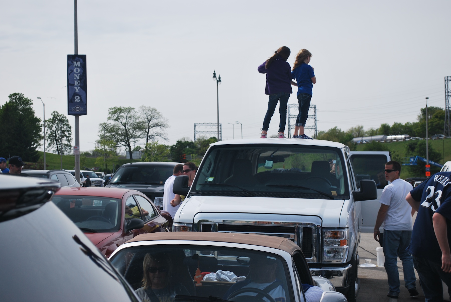 On our way back to the car we noticed something strange. From a distance we could see two people standing on the roof of a white van, but we couldn’t make out who. When we got closer we realized that they were young girls, I would say between 7 and 10 (I’m terrible with ages now). They were both standing up there, and when we were walking past, the adults were throwing things up there for them to catch (I think it was bottle caps). Now, I’m no parent, but I don’t think I’d want my kids on the roof of a van, when it would be pretty easy to slip or stumble off. Even though it may look like it, Crandall (pictured in white on the right) is not relieving himself next to the van.