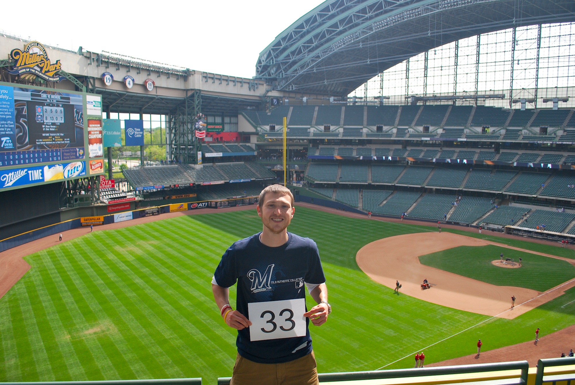 We pulled into the back of the Money lot at 11:45 and made our way towards Miller Park. There was no time to get the game number picture taken in the upper deck before the game. I told Crandall and Brietzke (the other attendee), that we’d have to get it done after the game, which they were fine with. I was in my seat with six minutes to spare. That was cutting it a little too close for comfort. Crandall and Brietzke had seats in section 228, and it was just me in my usual 221. After I learned that Tyler (the guy who slept in), was not going to make it, I posted a tweet asking if any of my tweeps wanted to join me for the game, but I think it was a little late.