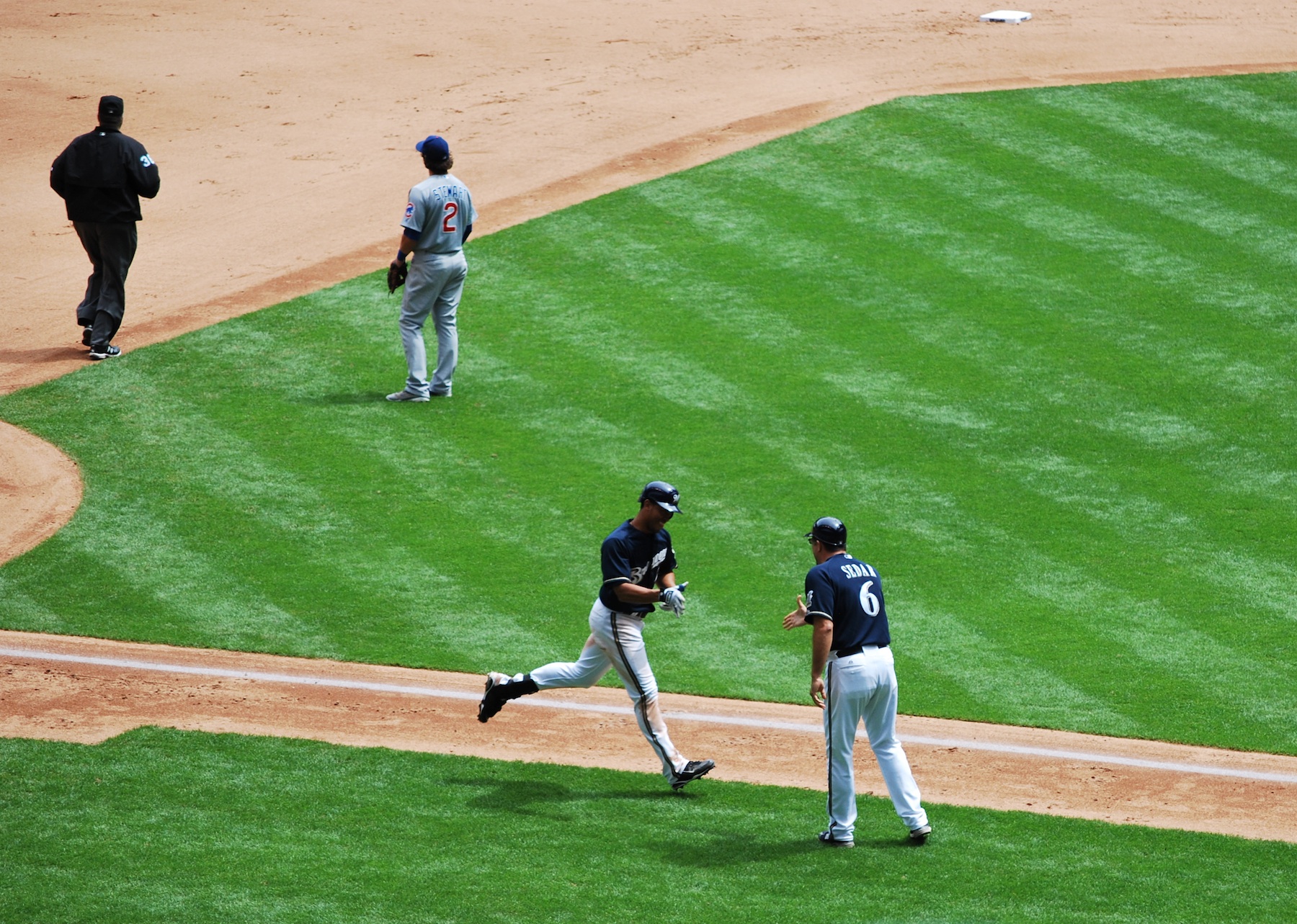 The game stayed tied at one a piece until the bottom of the sixth. Lucroy doubled to open the frame, and Braun followed with a single. Ramirez forced Braun out at second, but Lucroy came home with the go-ahead run. Corey Hart doubled, and Ramirez moved to third, leaving first base open. The Cubs thought they would be better off facing the light hitting backup infielder Edwin Maysonet (hmmmmm) and walked Ishikawa to get to him. On the second pitch Maysonet hit a Grand Slam to left field, and the Brewers grabbed control of the game with a 6-1 lead. Here’s Maysonet as he prepares to get a congratulatory hand shake from Brewers third base coach Ed Sedar.