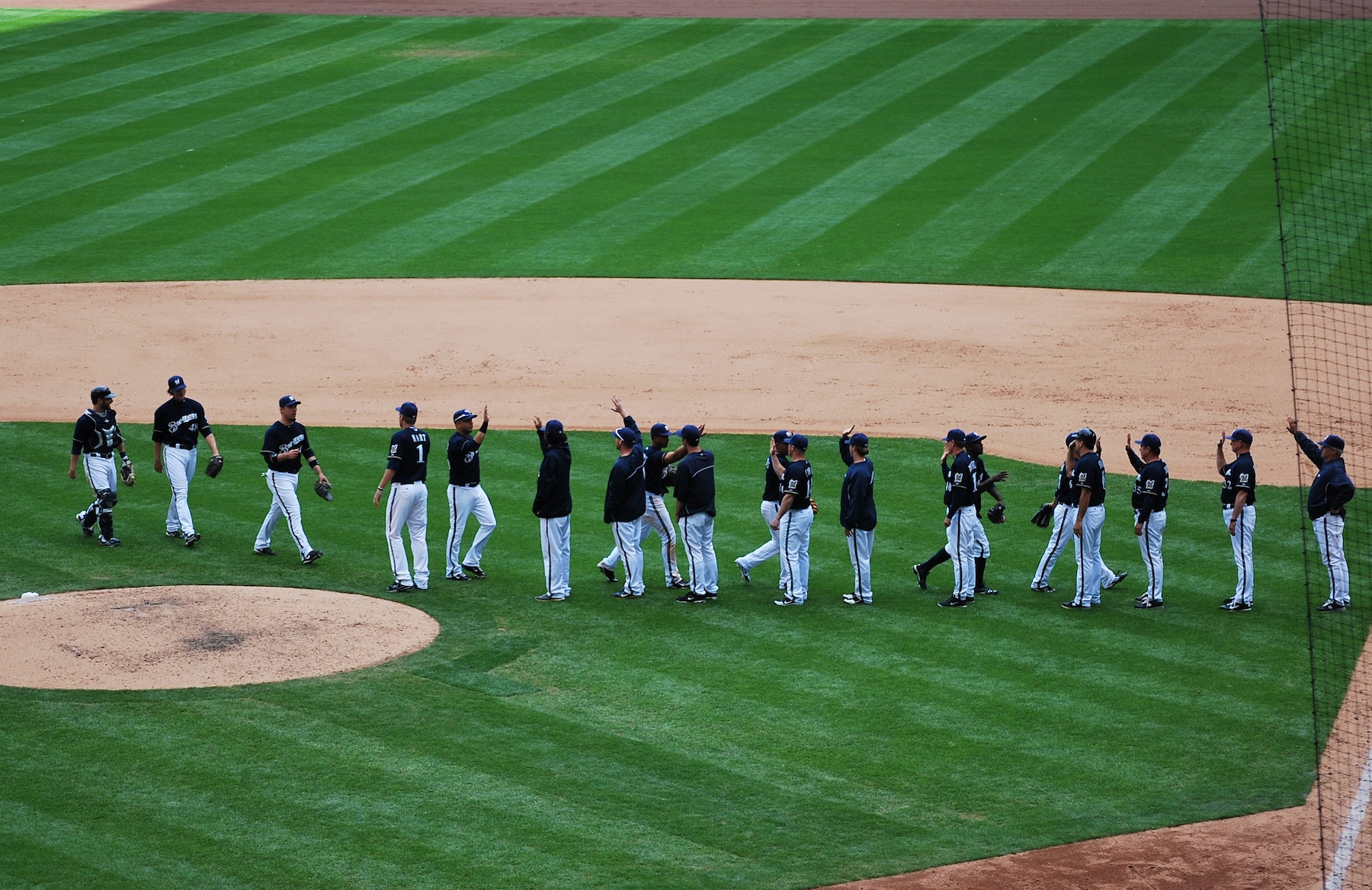 The Cubs put one on the board in the eighth, but the Brewers answered with two of their own in the bottom half, and that was all the scoring. Final Score: Brewers 8 – Cubs 2. More handshakes and high fives followed the victory. It was a great win for the Crew, a great outing from Marcum (7 ip, 3 H, 1 ER, 2 BB, 6 K), and a “salami” from an unexpected source.