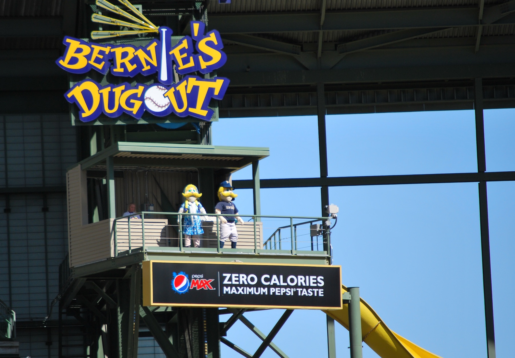 Bernie Brewer and his mom were up in Bernie’s dugout throughout the game, and I got a picture of them shortly after they finished dancing to Roll Out the Barrel. Bernie’s mom had a cane and was hobbling around up there. I think the cane was just part of the act, but I can’t say for sure.