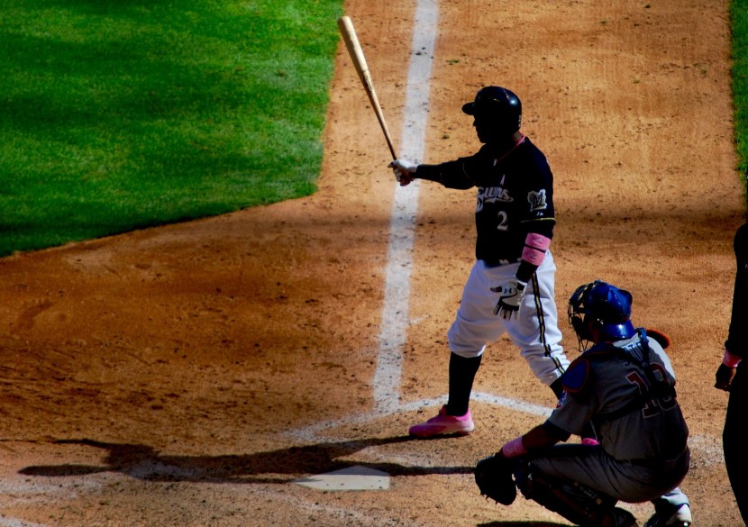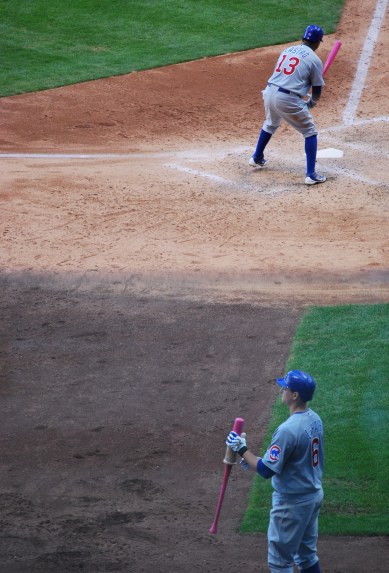 On Mother’s Day the MLB temporarily allows the use of pink bats to help raise awareness for breast cancer and the Susan G. Komen for the Cure organization. For some reason, none of the Brewers decided to use a pink bat. Some of the Cubs did, and the picture below shows Starlin Castro at the plate using one and Bryan LaHair in the on deck circle with one as well. Bill Hall, a former Brewer, hit a walk-off home run using a pink bat on Mother’s Day back in 2006, with his mother in the stands. The bat went to auction and Mark Attanosia (the Brewers owner) won the bat with a $25,000 bid, and gave the bat to Hall’s mother. The home run provided a great moment, and Attanasio made it last with the very kind gesture.