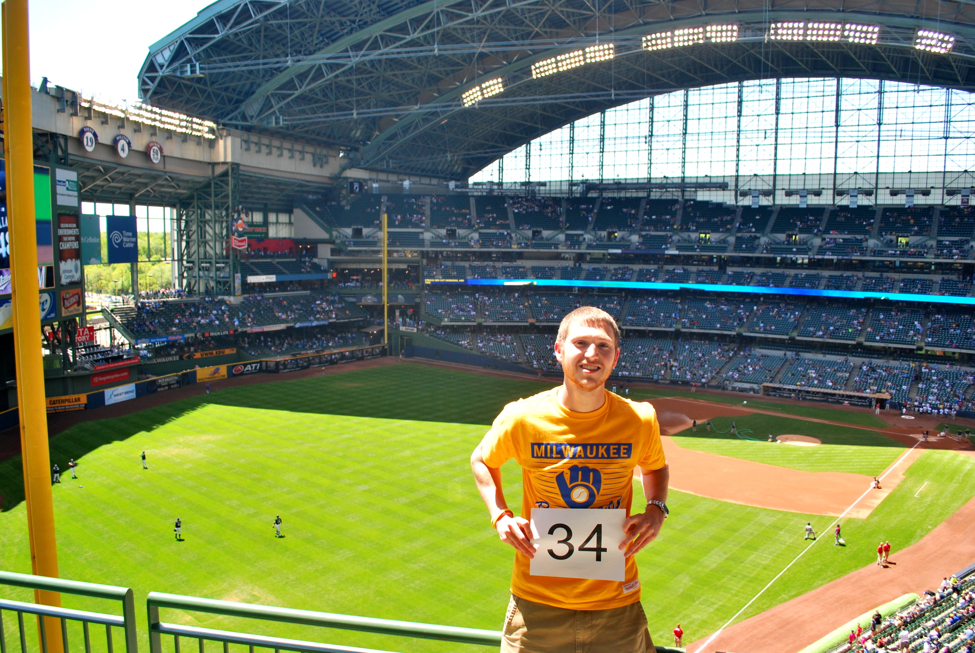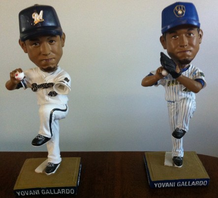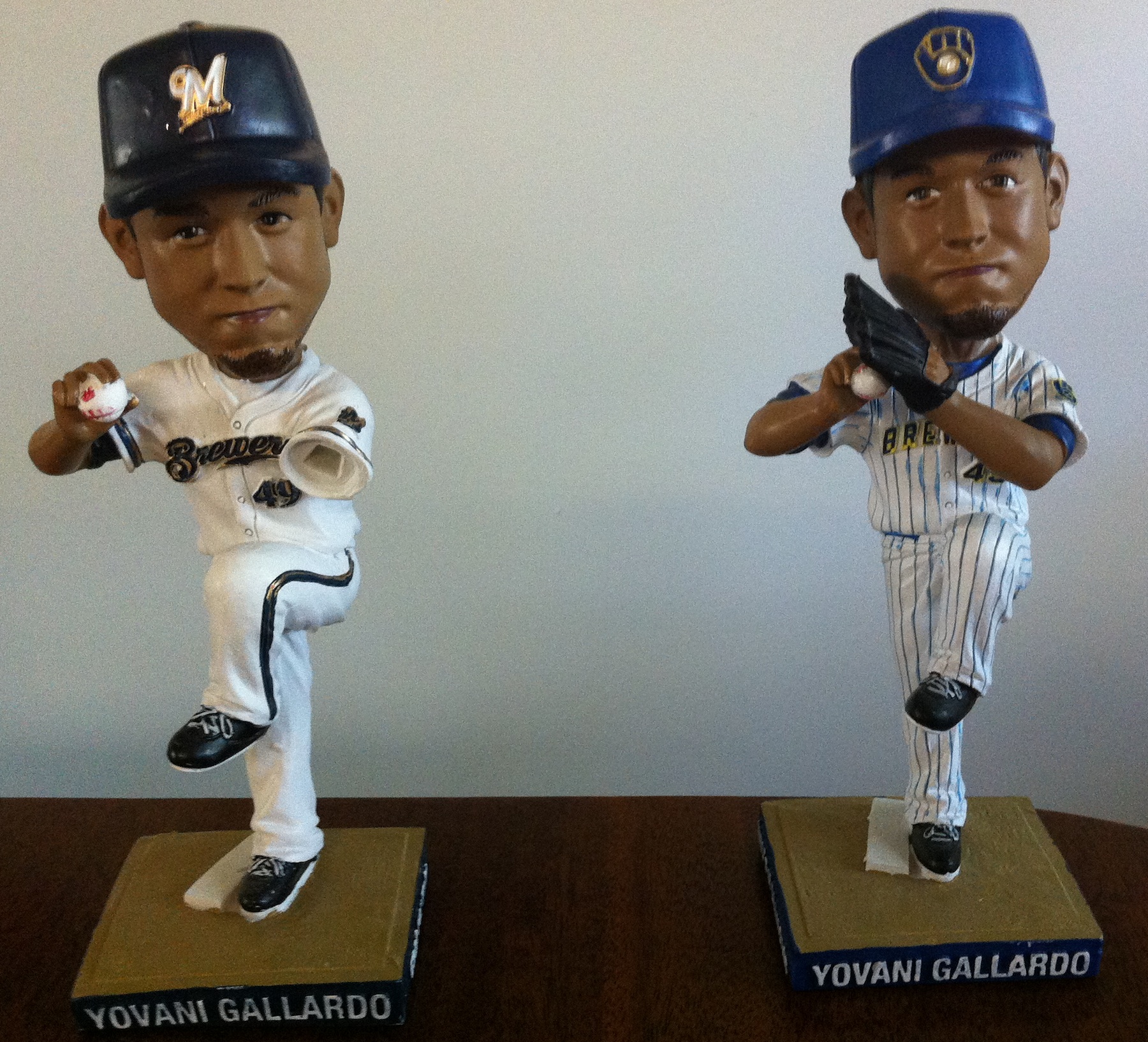 We got to the Cooooooooooooper parking lot at 12:30, and decided to try and get the game number picture taken before the game. The line to get into Miller Park was quite long, because it was somewhat close to first pitch, and it was a sellout for the Yovani Gallardo bobblehead. We opened the boxes and saw that one of them was the retro version (NICE!), but didn’t take them all the way out to inspect. When we got home I took them out, and to my surprise one of them displayed Gallardo in a post-dismemberment fashion. I should’ve checked them right away, and then asked for a replacement, but we were in a hurry. I’m hoping I can exchange it during the next home-stand, but there’s no guarantee that they’ll believe me. I’m a (somewhat) honest person, but there are probably people who accidentally break it, and then come back and claim it was like that when they got it. This was such a clean “break”, that if it came with the arm loose in the box I would’ve probably just glued it back on myself.