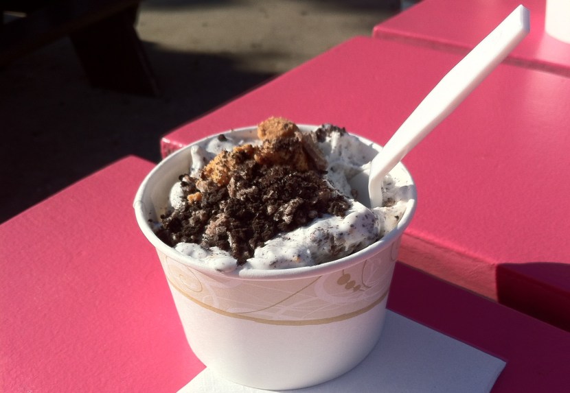 After getting back to town, we decided to hit up Frostie Freeze, Fort Atkinson’s answer to any soft serve ice cream establishment on planet earth. I may be a little biased, but not much. It opened in 1983 and has been providing Fort Atkinson with ice cream and other cold treats for almost three decades now. It’s open during the Spring and Summer months, and if you’re ever in town I suggest you make a visit. The first picture is of the exterior of Frostie Freeze, which is located on Madison Avenue, just across the street from Vos Sentry Foods. The second picture is what I ordered; an Oreo-peanut butter cup Candy Freeze. At $2.50 it’s a steal.