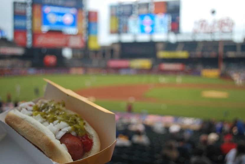 On the way to my seat I made a pit stop at a concession stand, and picked up a Nathan’s Famous Hot Dog. It was $6, but I’ll say it was at least close to being worth it. I got to my seat, and quickly devoured the dog before the national anthem. Before doing so I got the hot dog with the field in the background. They had ketchup, mustard, onions, relish, and jalapeños as condiment offerings. I put on everything but the jalapeños. I like jalapeños, but just wasn’t in the mood for a spicy dog.