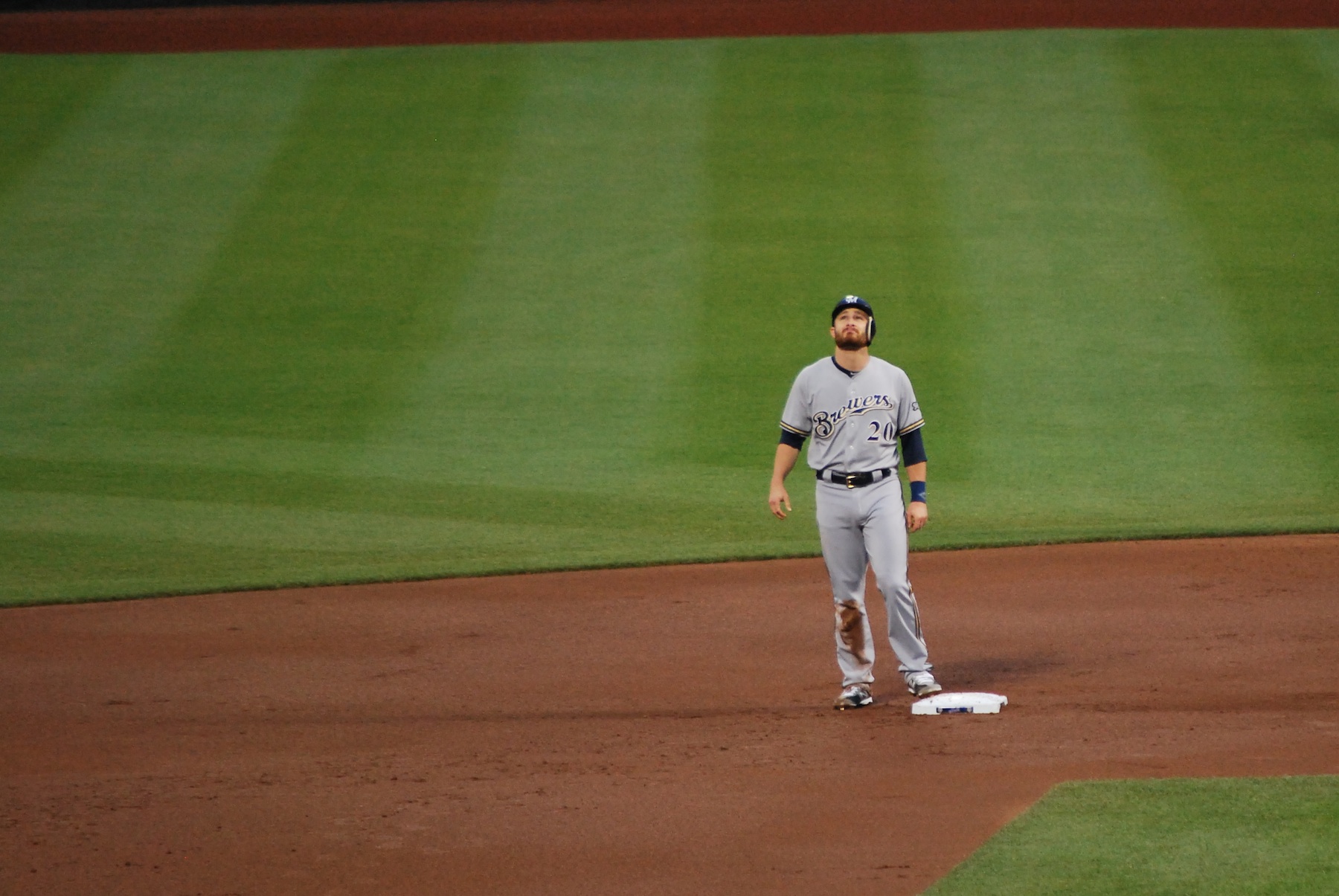 The game got underway, and the Brewers quickly had a runner in scoring position. After Nyjer grounded out Lucroy singled, and advanced to second on Braun’s groundout. I had my camera and was zoomed in on Lucroy at second base when I felt a raindrop hit my forehead. Lucroy must’ve had the same thing happen as I was about to take the picture, because Lucroy began looking skyward.