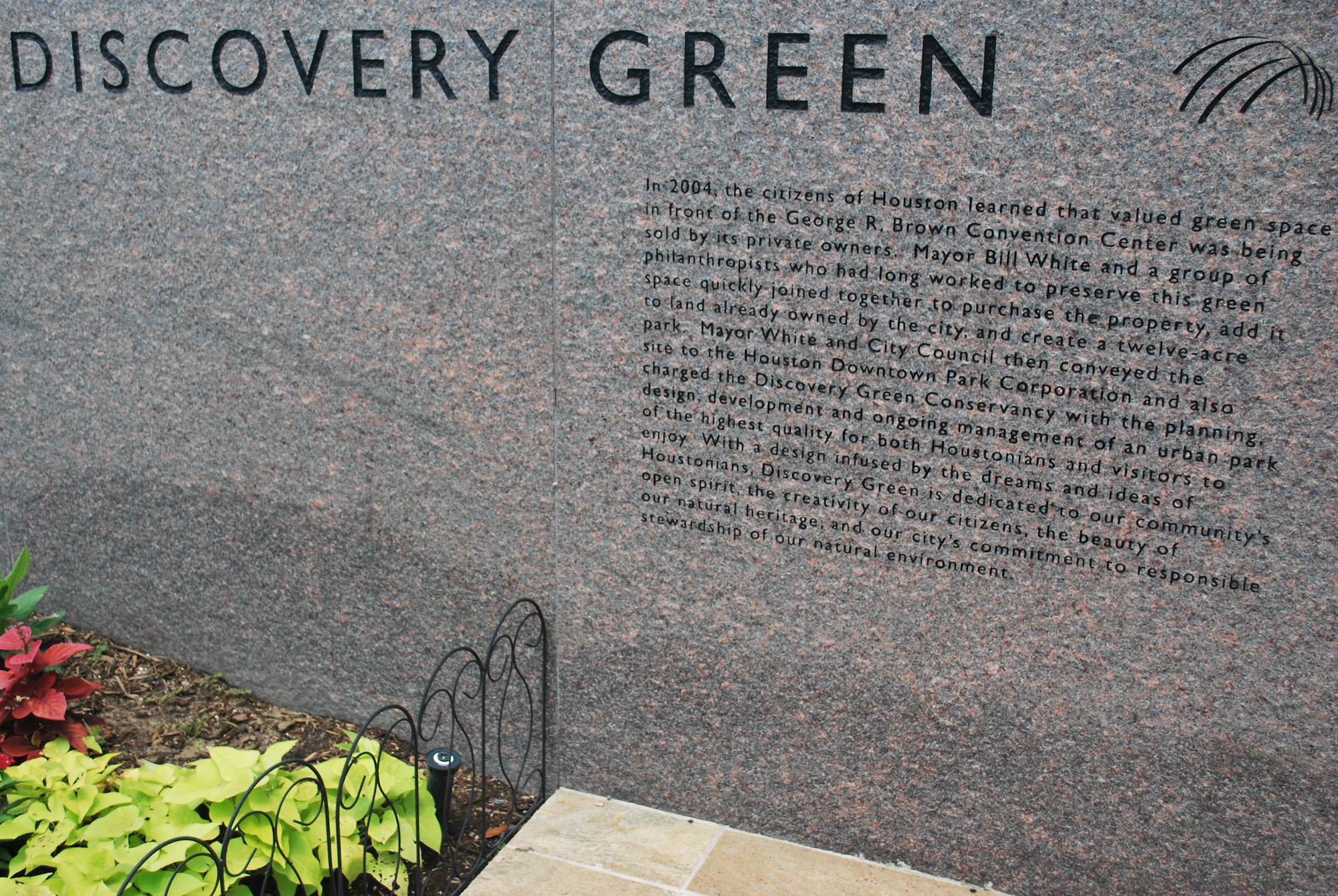 In 2004, the citizens of Houston learned that valued green space in front of the George R. Brown Convention Center was being sold by its private owners. Mayor Bill White and a group of philanthropists who had long worked to preserve this green space quickly joined together to purchase the property, add it to land already owned by the city, and create a twelve-acre park. Mayor White and City Council then conveyed the cite to the Houston Downtown Park Corporation and also charged the Discovery Green Conservancy with the planning, design, development and ongoing management of an urban park of the highest quality for both Houstonians and visitors to enjoy. With a design infused by the dreams and ideas of Houstonians, Discovery Green is dedicated to our community’s open spirit, the creativity of our citizens, the beauty of our natural heritage, and our city’s commitment to responsible stewardship of our natural environment.